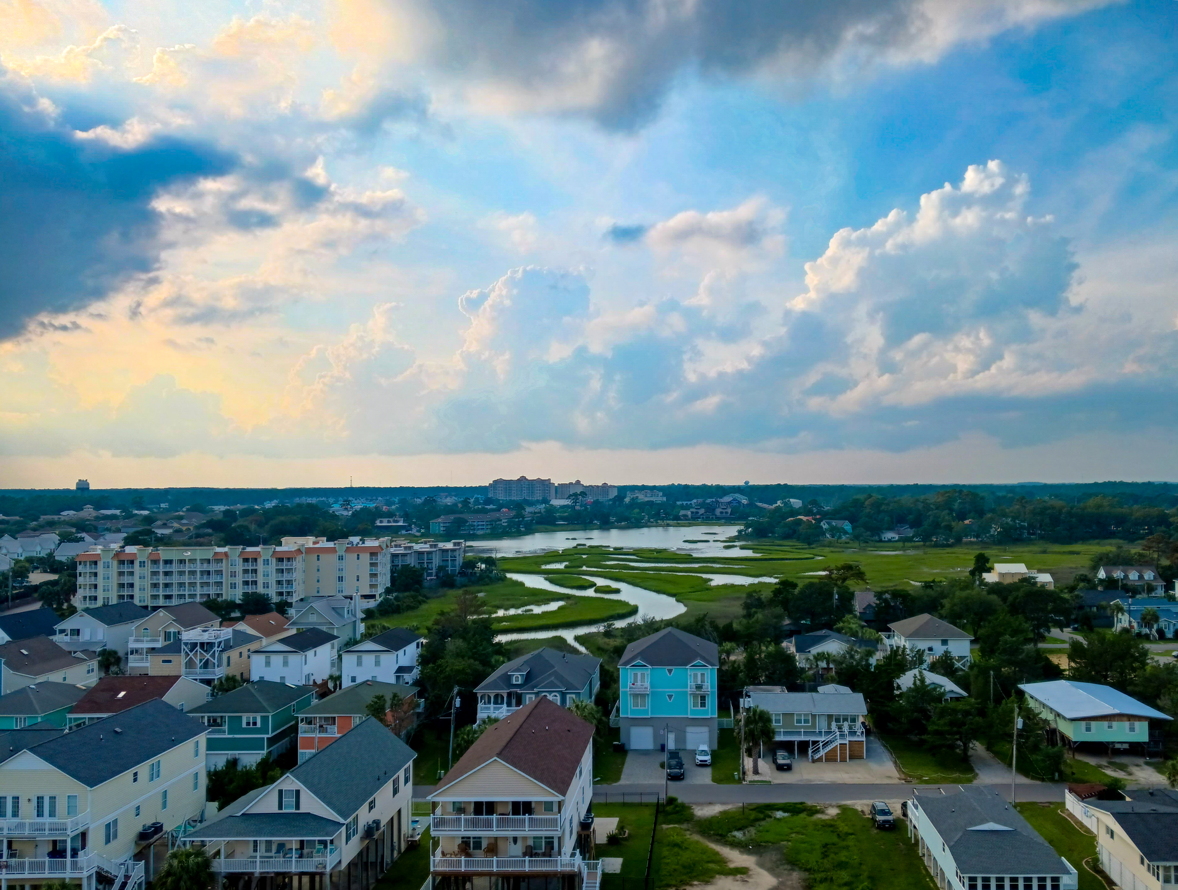 Three-story colorful homes are in the foreground. The green marsh is the middle ground. An apartment building appears in the upper left middle of the photo. The blue sky reveals a photo taken at either sunrise or sunset.
