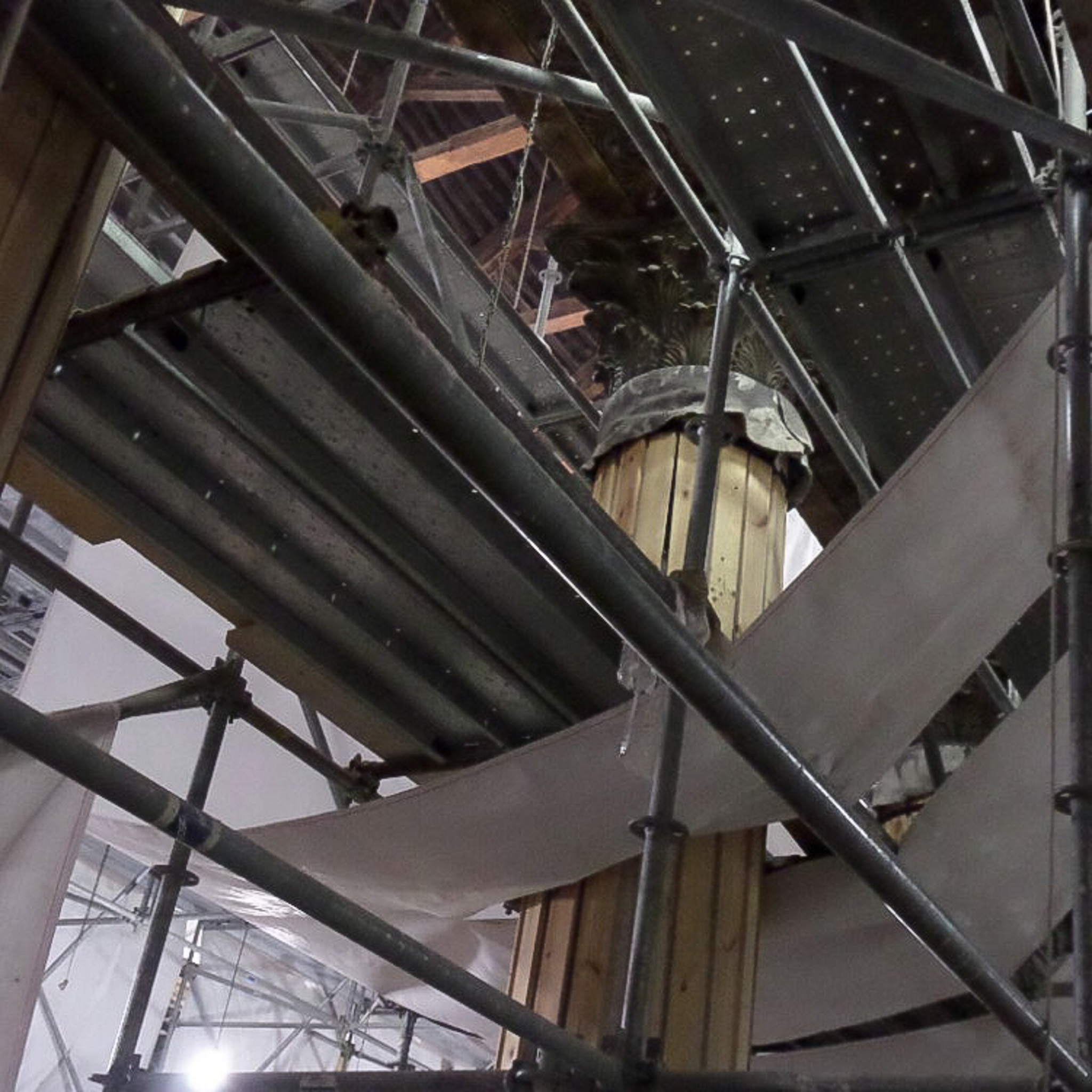 During restoration (2016), the pink limestone columns that supported the nave were protected with boards and scaffolding supported the root. Here you can catch a glimpse of the Corinthian capital.