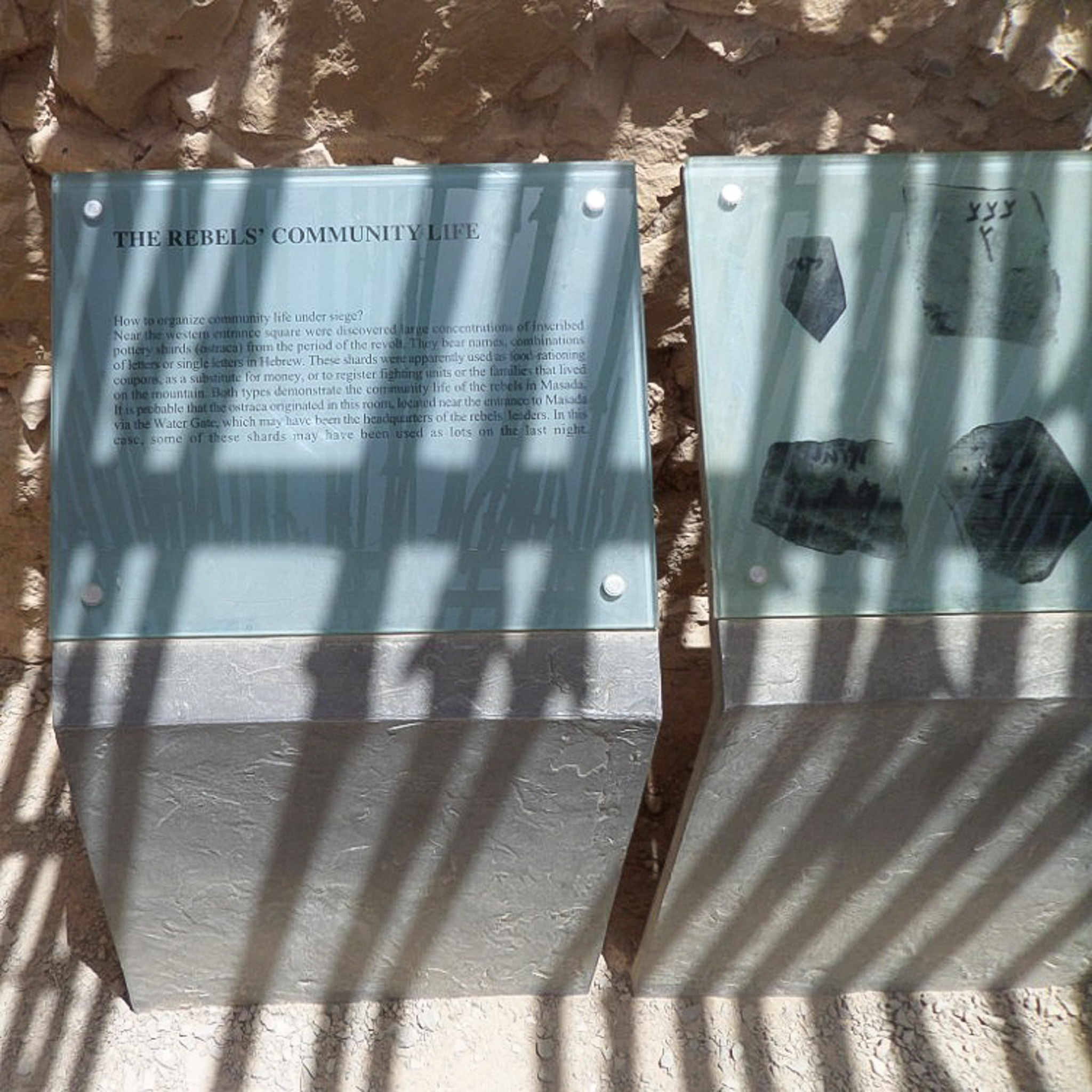 A sign about "The Rebels' Community Life" describes inscribed pottery shards that were perhaps used for food rationing, as currency, or even to register fighting units. The sign (as photographed here) does not appear to use the techical words ostrica (plural) or ostricon (signular) for borken pottery pieces with writing.