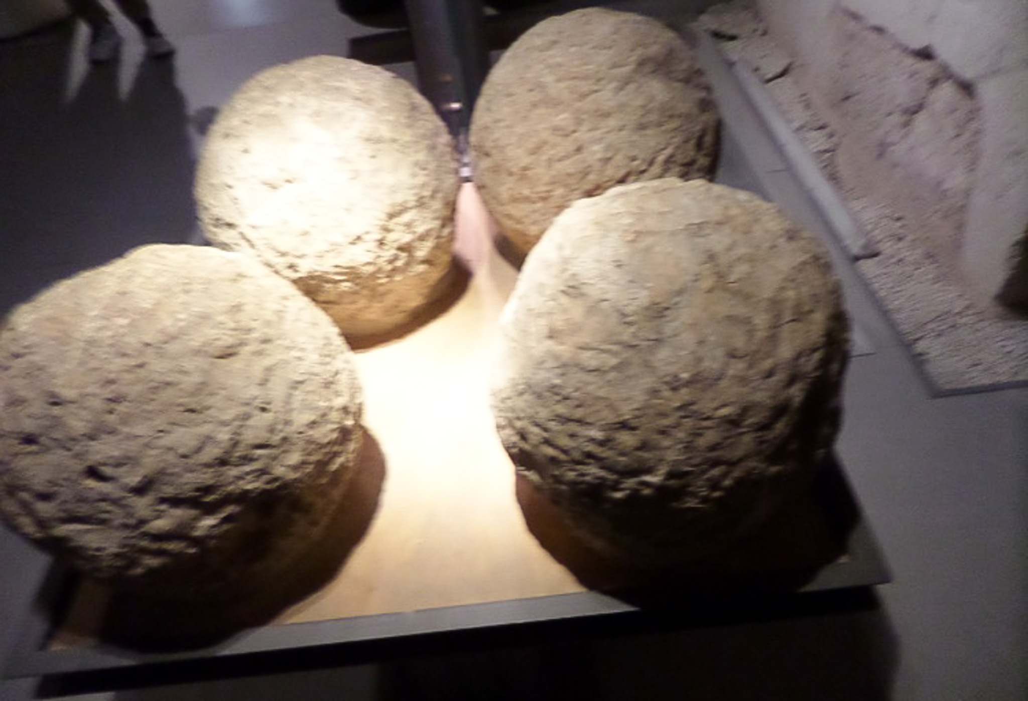 Near a sign describing the siege of Acre by the Mamluks in 1291, there are several ballestrae, or stones that were used as projectiles during the battle.