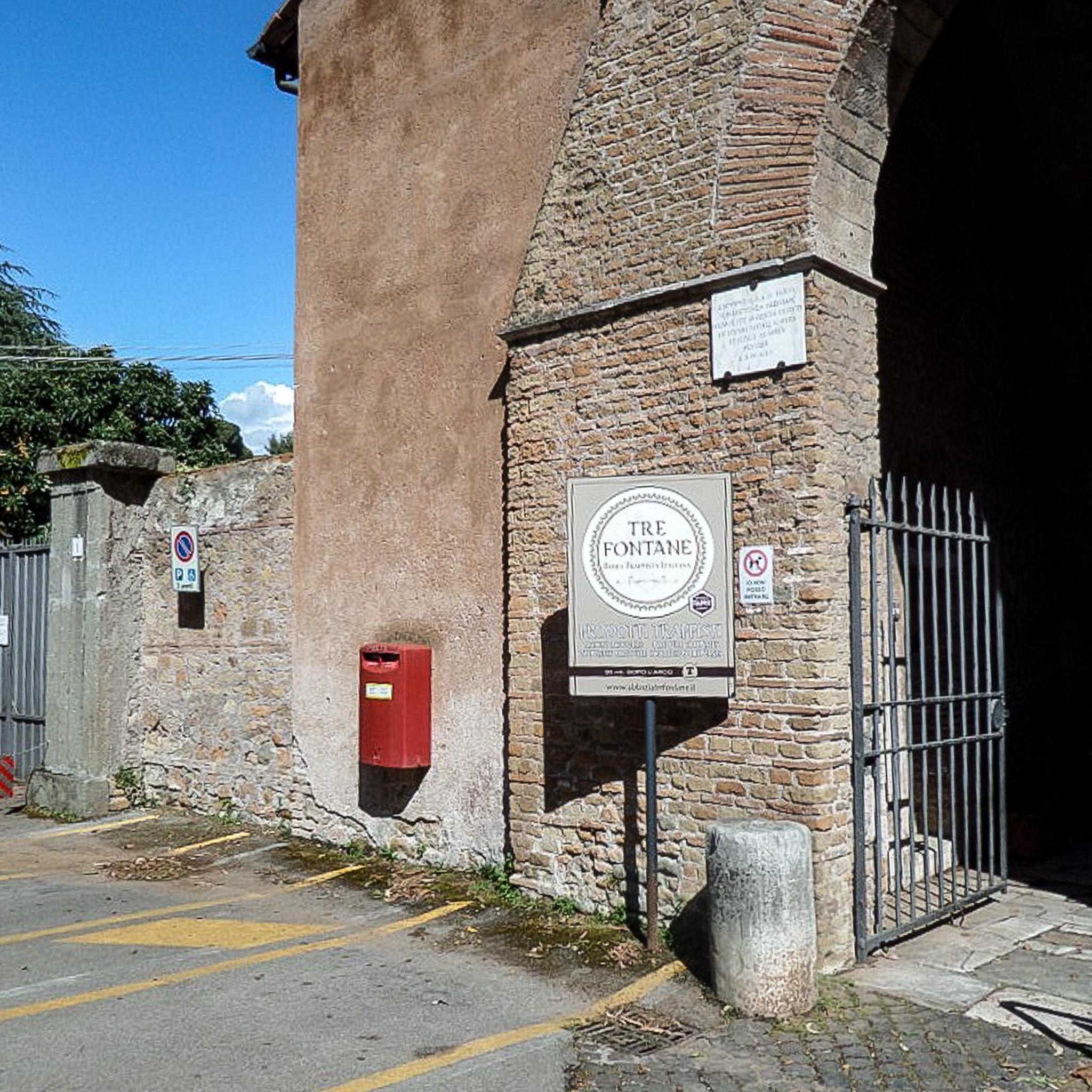 Various signs to the left of the Arch of Charlemagne within the Three Fountains Abbey Complex (Rome, Italy). The Arch of Charlemagne is the entrance to the actual abbey complex of the Abbazia delle Tre Fontane (Abbey of the Three Fountains) in Rome, Italy. The complex is four miles outside Rome, run by Cistercian monks belonging to the Trappist order. It contains three churches, of which the Church of Saint Paul at the Three Fountains (Church of the Martyrdom of Saint Paul; San Paolo alle Tre Fontane; Church of St. Paul the Apostle) is most sacred. This church was built on the site where Saint Paul was beheaded on Emperor Nero's order. As a Roman citizen, Saint Paul could not be executed within the city. The other two churches in the complex are the earliest one: the Benedictine Church of Saint Vincent and Saint Anastasius, built in 626; and the 16th century Roman Catholic Church of Saint Maria Scala Coeli, where Saint Paul stopped to pray for the last time before he was beheaded. The legend is that Paul's head bounced three times and fountains sprang up at each spot; hence, the title of "Three Fountains." Actually, fountains already existed at the site when Paul was beheaded. The Arch of Charlemagne was built in the 13th century and is named after Charlemagne because he endowed the Abbey. On the ceiling of Charlemagne's Arch are fragments of frescoes, including the attributes of the four Evangelists: the Angel for Saint Matthew, the Lion for Saint Mark, the Ox for Saint Luke and the Eagle for Saint John.