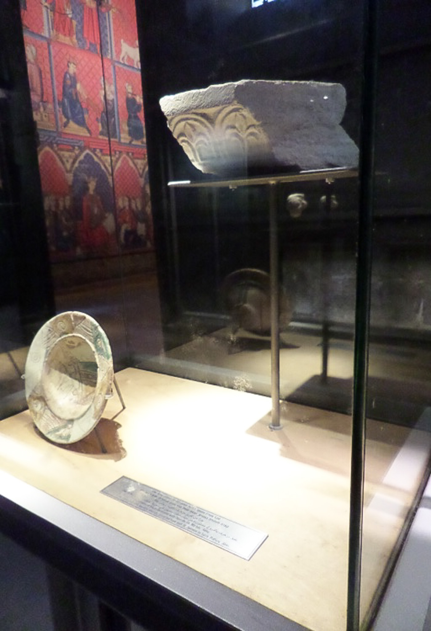 A frieze decorated with fleur-de-lis is on display in one of the meusum cases at Acre's crusader fortress. In the same case is a bowl with heraldic sheilds which was imported from Syria.
