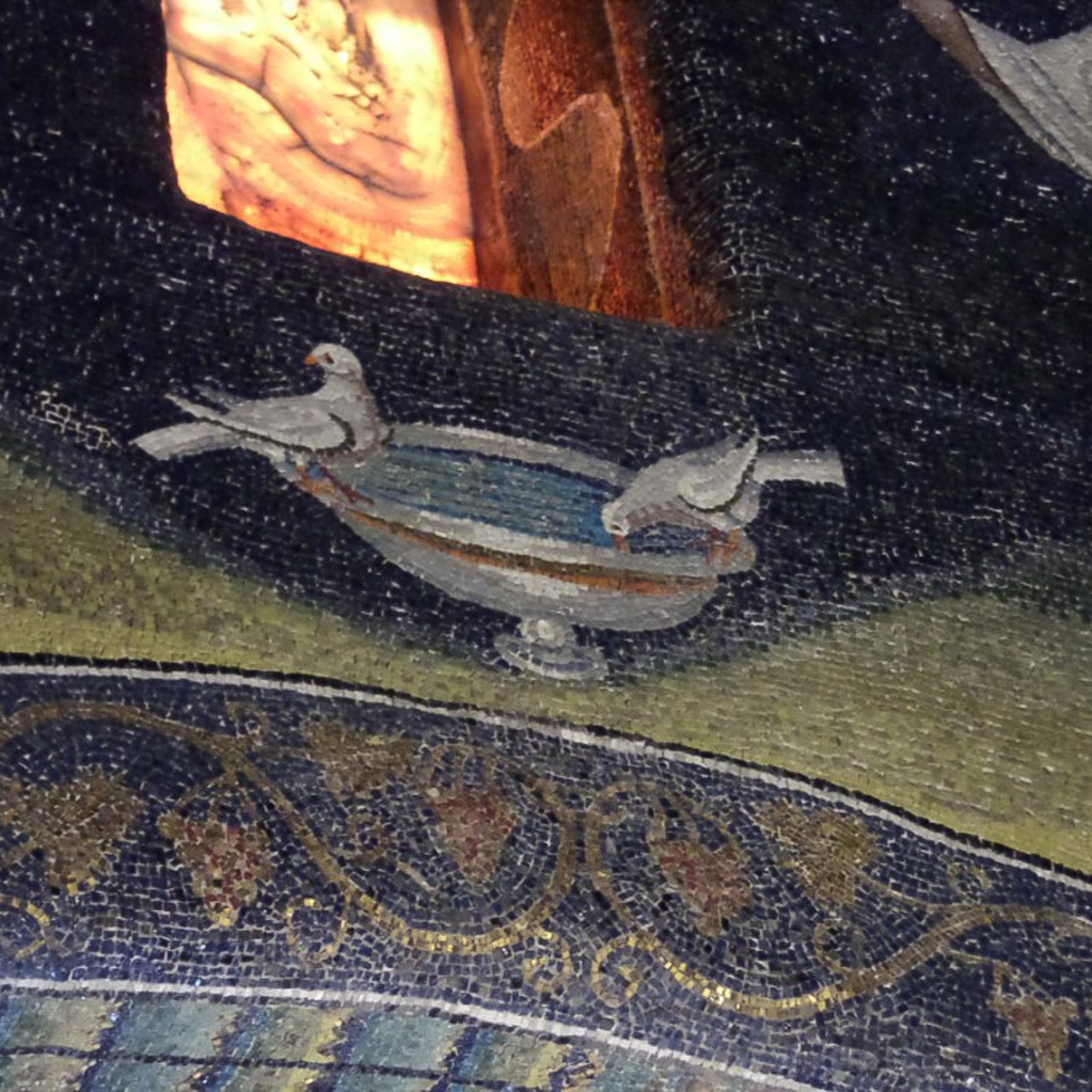 Detail image of the two doves. Below the alabaster window in each drum lunette of the Mausoleo di Galla Placidia (Galla Placidia Mausoleum; Mausoleum of Galla Placidia) in Ravenna, Italy, two doves represent spirits in search of eternal peace who are attempting to quench their thirst for salvation at a water basin.