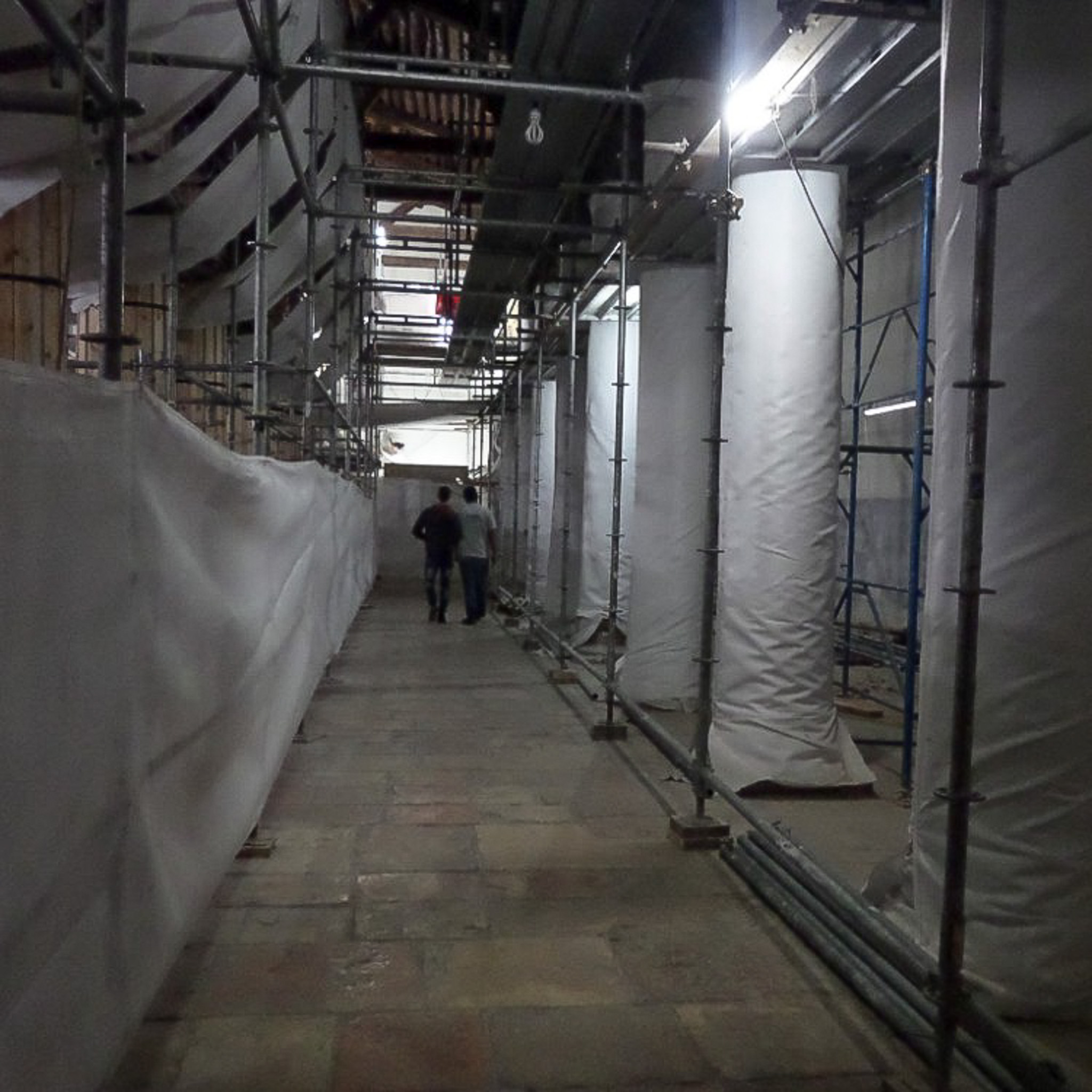 The nave is supported by two double rows of Corinthian Columns. Here one sees the aisle on the Northside of the nave while looking east down the aisle.. One sent of columns (which actually have painted images) are covered with batten boards. The outermost row are simply wrapped in white sheeting.