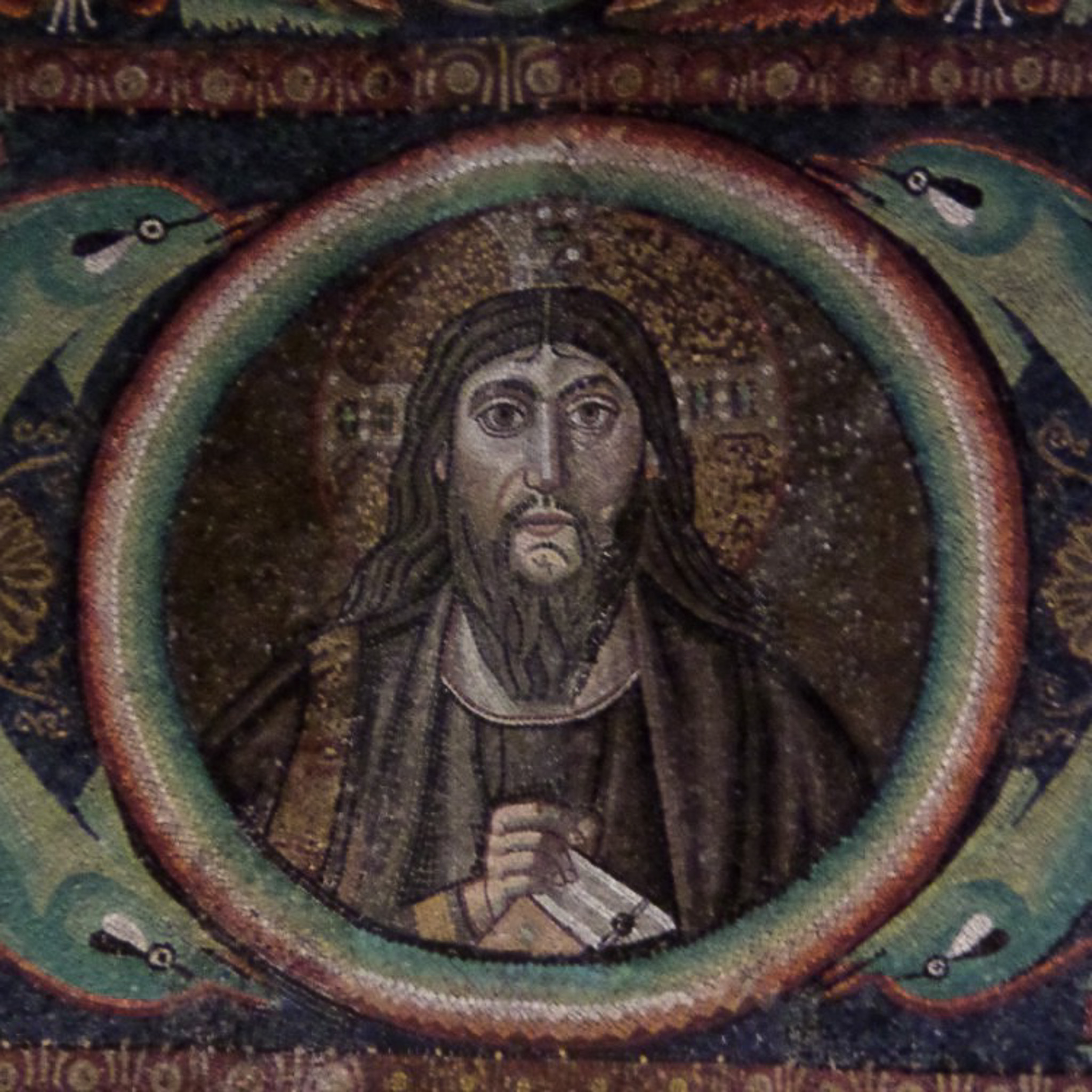 One of the fifteen medallion mosaics that line the triumphal arch to the Presbytery in the Basilica San Vitale (Basilica of St. Vitale; Church of Saint Vitale) in Ravenna, Italy is that of a bearded Jesus Christ. This medallion is in the middle of the intrados. In this photo, the green dolphins, symbolic of salvation, are clearly visible.