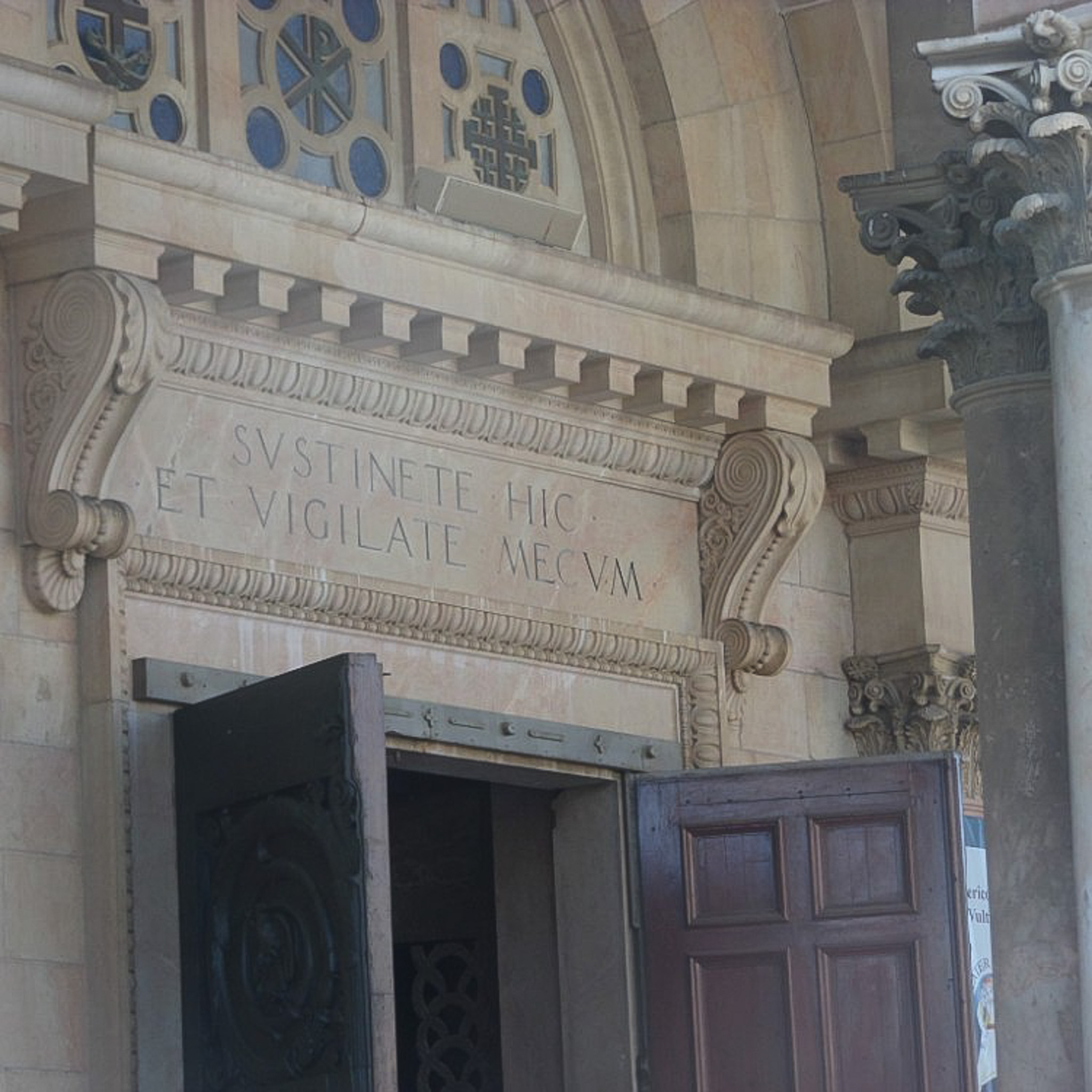Above the door of the Church of All Nations is a portion of Matthew 26:38 in Latin. It translates to "Wait here and watch with me".
