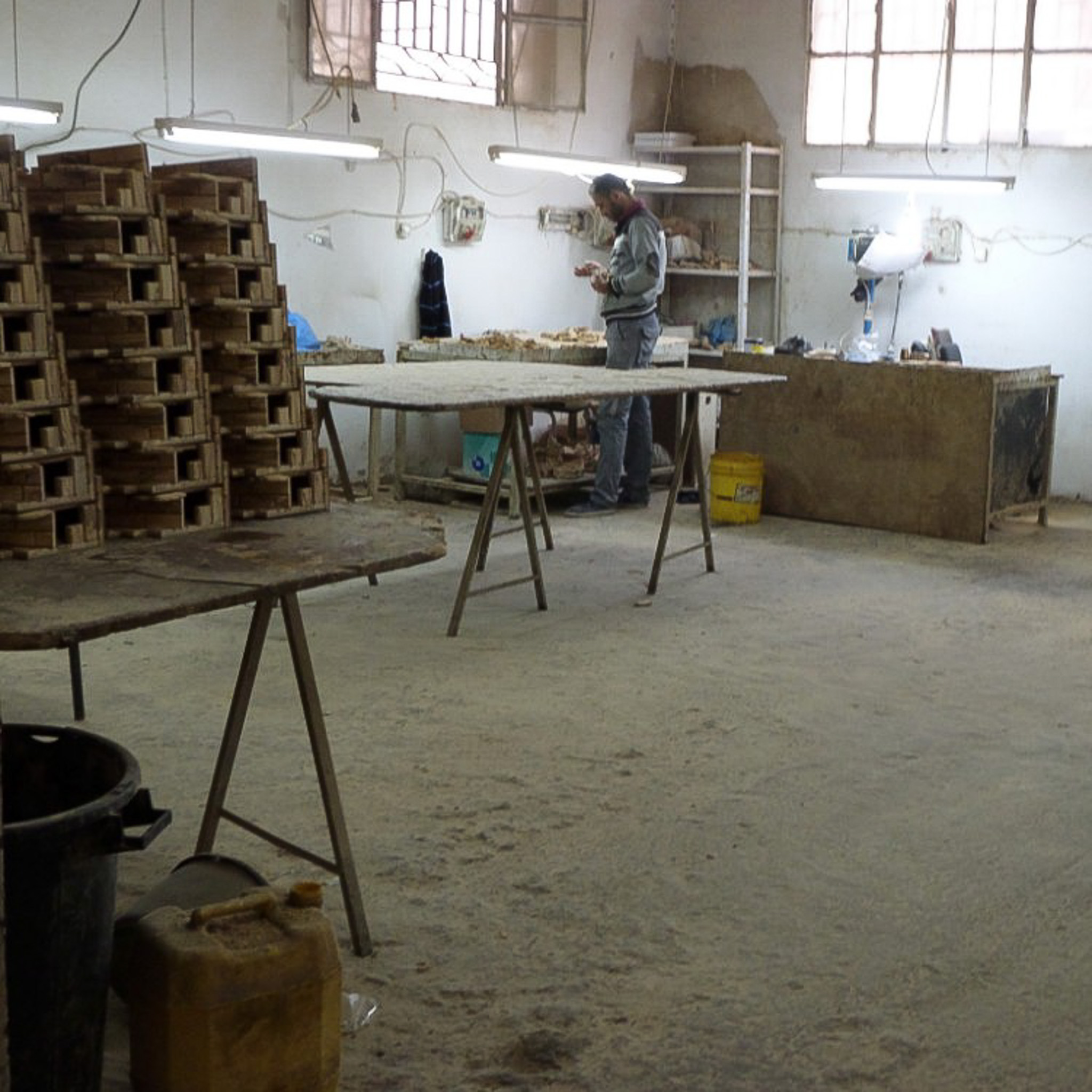 Tourists are treated to a glimpse into a woodworking shop in Bethlehem. Carvings of olive wood, both by machine and hand, are sold in souvenir shops.