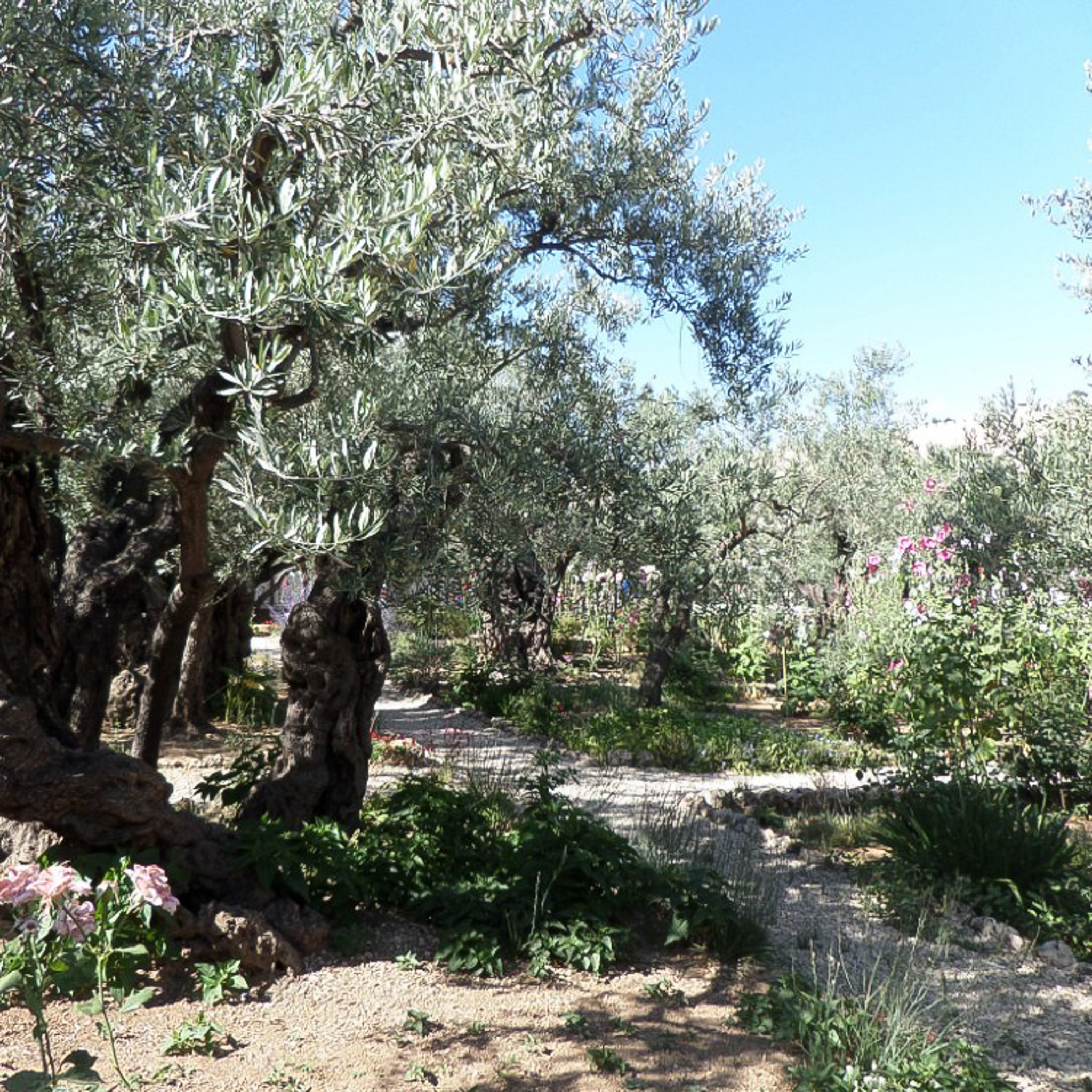A garden pathway in the Garden of Gethsemane adjacent to the Church of the Agony.