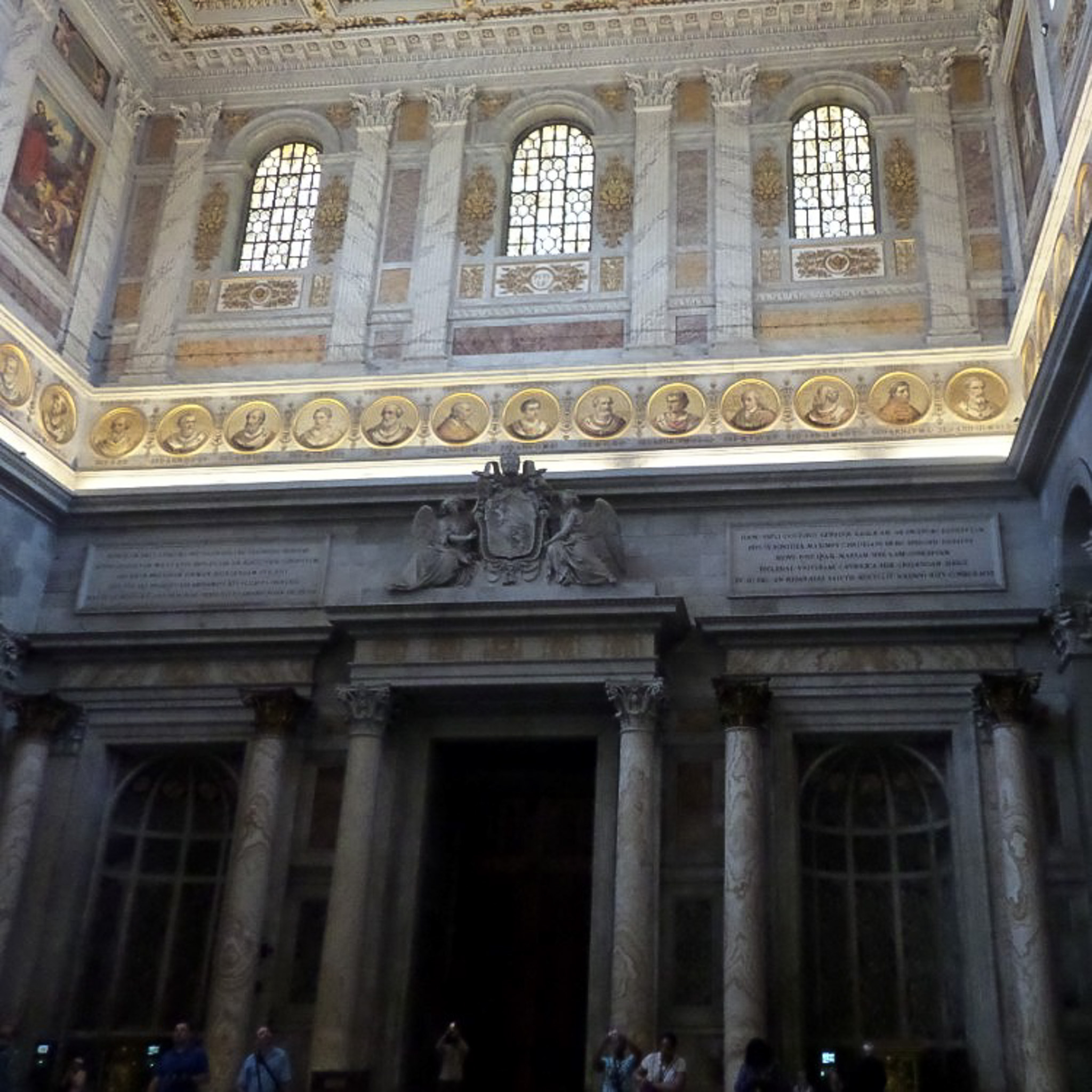 Mosaic medallions in the nave of the Papal Basilica of Saint Paul Outside the Walls (Rome, Italy) depict all of the popes through history. Above the round medallions, pilastered Corinthian columns flank arched windows. Large frescoes also appear in this register of the nave, as shown in the upper left of the photograph.
