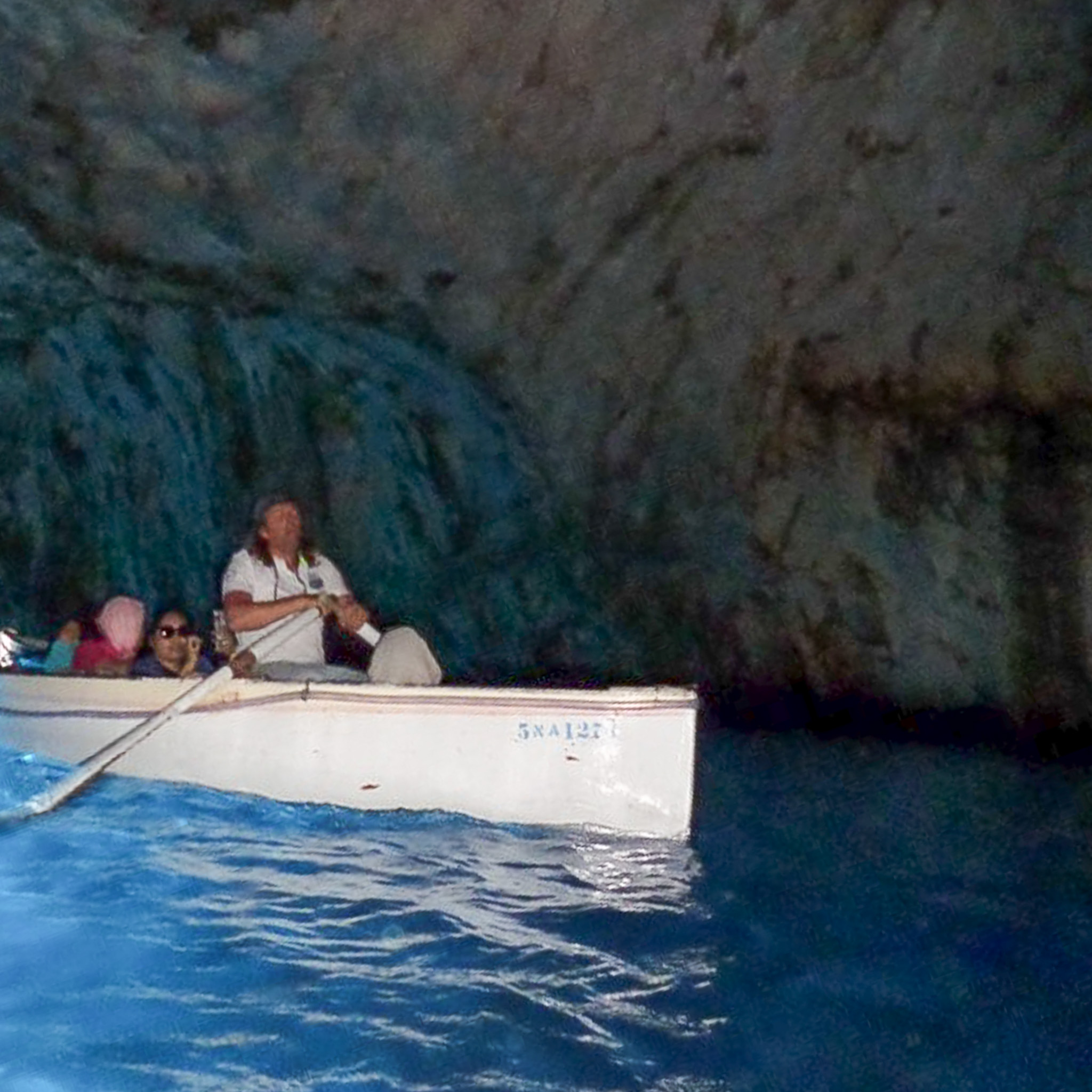 Interior of the Blue Grotto (Grotta Azzurra) sea cave on the northwest coast of Capri in the municipality of Anacapri, Italy. Small boats are necessary, with the passengers laying down in the boats while entering, as the mouth of the cave is only one meter high by two meters wide. The natural sea cave is 60 meters long and 25 meters wide. The Blue Grotto is the most famous sight on Capri Island. It is named for the azure blue light inside the cavern, where the water is a crystalline blue with silver reflections. The walls of the sea cave are limestone.