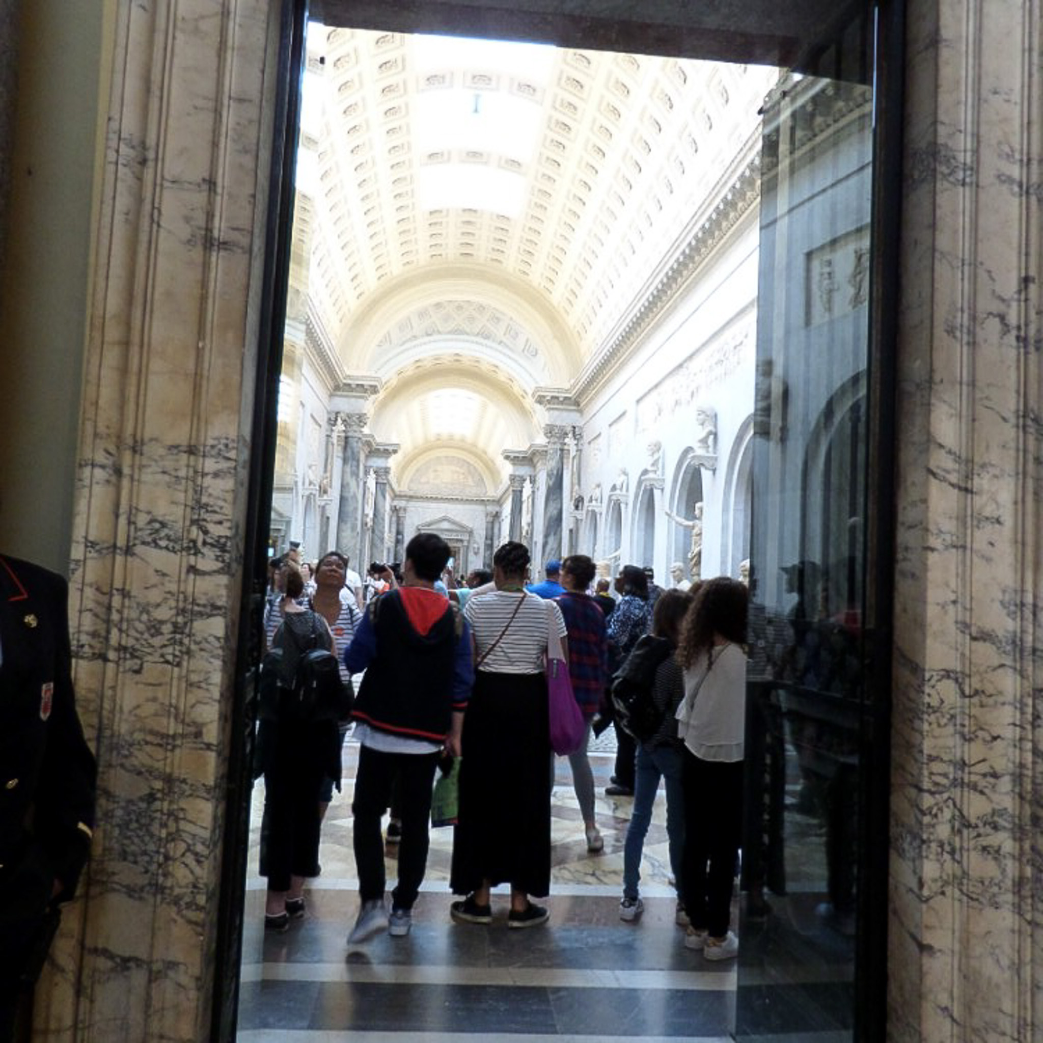 Entering the New Wing (Braccio Nuovo) of the Chiaramonti Museum, which houses about a thousand sculptures. The museum is part of the Vatican Museums. The Vatican Museums are public galleries that display about 20,000 of 70K works collected by the Catholic Church and the papacy throughout the centuries. The museums were founded by Pope Julius II in the early 16th century. Only the Louvre in France receives more annual visitors than the Vatican Museums. The museums consist of 24 galleries, with the Sistine Chapel being the last room visited. The Chiaramonti is named after Pope Pius VII, who was born Barnaba Chiaramonti, and founded it in the 19th century. The New Wing was added in 1822. Another part of the Chiaramonti, the lapidary gallery, contains over 3000 tablets and stone inscriptions, but is only open to scholars on request.