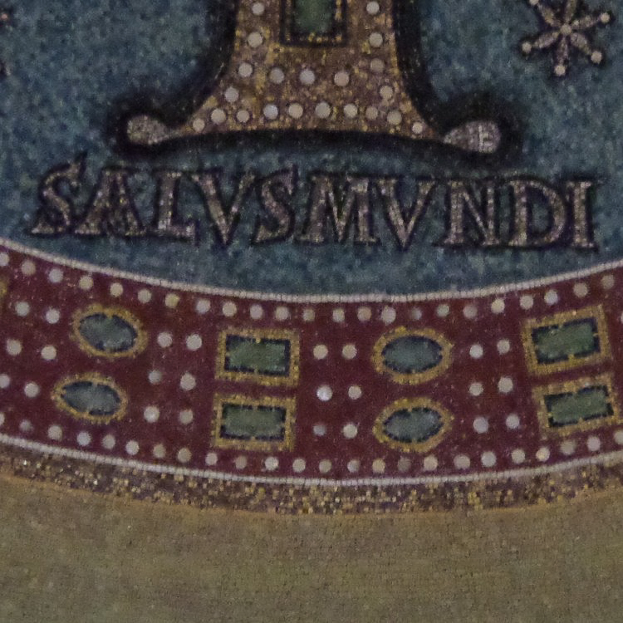 The Latin words "Salus Mundi," or Salvation of the World, which appear below the central gold cross of the apsidal conch in the Basilica of St. Apollinare in Classe (or Basilica of Sant'Apollinare in Classe, or Saint Apollinaris in Classe), which is located in Ravenna, Italy.