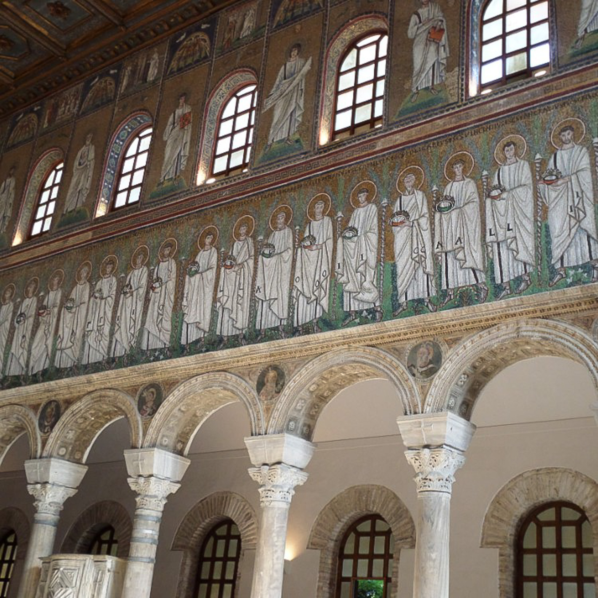 The south wall of the nave, Basilica of Sant'Apollinare Nuovo (Basilica di Sant'Apollinare Nuovo) in Ravenna, Italy. A line of male saints is shown in the central portion of the photograph. They are progressing toward the apse of the church. Although not shown in the photograph, they are led by St. Martin, to whom the Church was rededicated after the Ostrogoths were vanquished; St. Martin opposed Arianism. Like the female saints on the north wall, the male figures are haloed and carry crowns. Above this frieze, among the clerestory windows, is the second tier of mosaic decorations. This band features male saints (or prophets), each holding a scroll or a book. Above the male figures are 13 panels relating to Christ's Passion and Resurrection.
