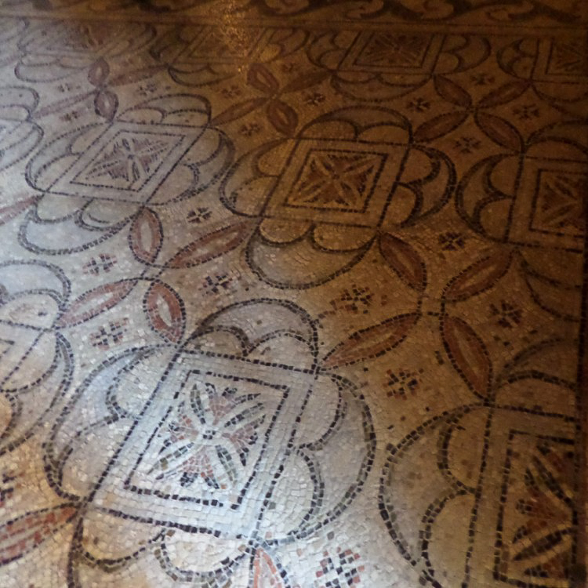 Larger view of the mosaic floor pattern of the Basilica San Vitale (Basilica of St. Vitale; Church of Saint Vitale) in Ravenna, Italy. The church's mosaics are some of the most-studied works in Byzantine art.