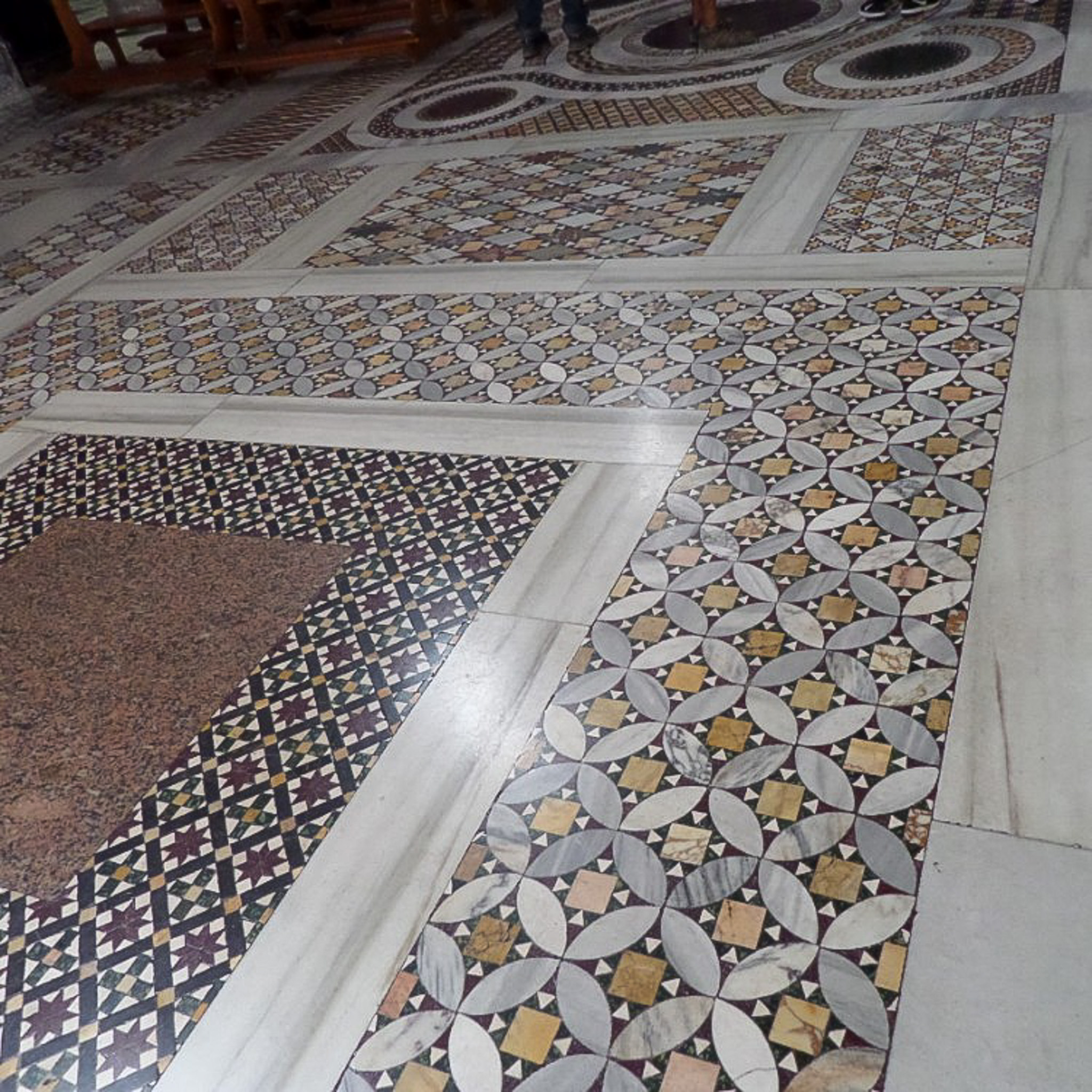 The Basilica of Saint Praxedes (in Italian: Basilica di Santa Prassede, commonly known as Santa Prassede) is a Catholic basilica located in the Rione Esquilino (or district of Esquiline). Esquiline is the name of a Roman hill, one of seven on which the ancient city was built. The church was rebuilt by Pope Pasquale I in 822 CE and was restored multiple times since then. It was built principally as a resting place for the relics of Roman martyrs and was dedicated to the second-century Saint Praxedes, who was the daughter of a Roman senator. Along with her sister, Praxedes provided comfort and care to Christians persecuted in the Roman Empire. The sisters were murdered for burying early Christian martyrs, which defied Roman law. The church is known for being the most important example of early Christian Byzantine art in Rome because of the mosaics decorating its apse and side chapels. The photograph shows the mosaics of the marble floor, according to the opus sectile style, in which the mosaic pieces are cut in shapes to fit the component parts of the design; in this case, as part of a Cosmatesque or Cosmati floor. This style of floor was named for the Cosmati family, who led the craftsmen of Rome in creating geometrical marble decorations.