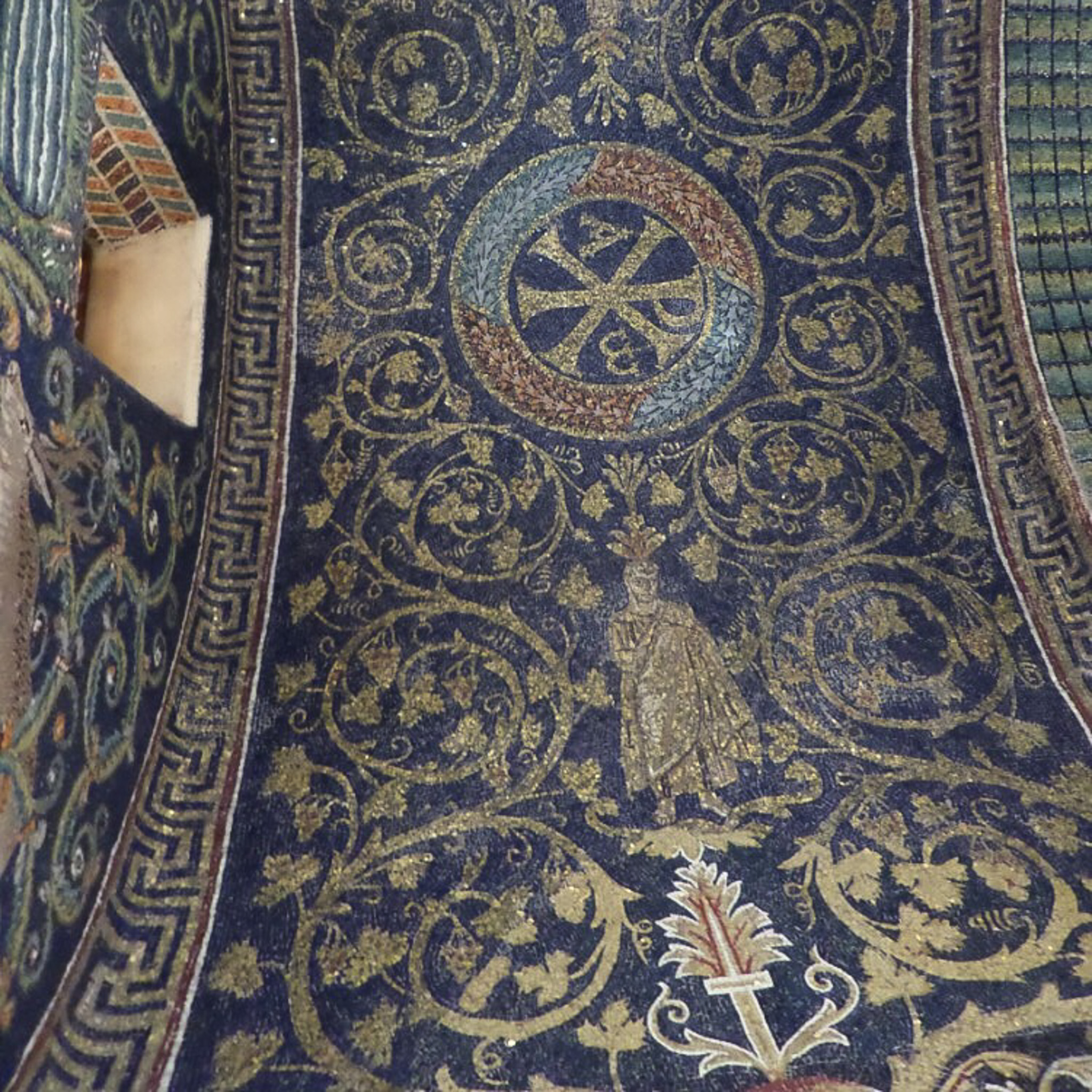 Ceiling mosaic of a barrel vault in the Mausoleo di Galla Placidia (Galla Placidia Mausoleum; Mausoleum of Galla Placidia) in Ravenna, Italy. A central medallion victory wreath contains a Chi-Rho, which is the first two letters of Christ's name in Greek (XP), flanked by the beginning and end symbology of the Alpha and Omega, which are also Greek letters. The grape vines (which grow from acanthus leaves at their bases) twine around the medallion and are representative of the wine of the Last Supper--the blood of Christ. Amid the vines are two men, each with a scroll; in this photograph, we see only one of the men.