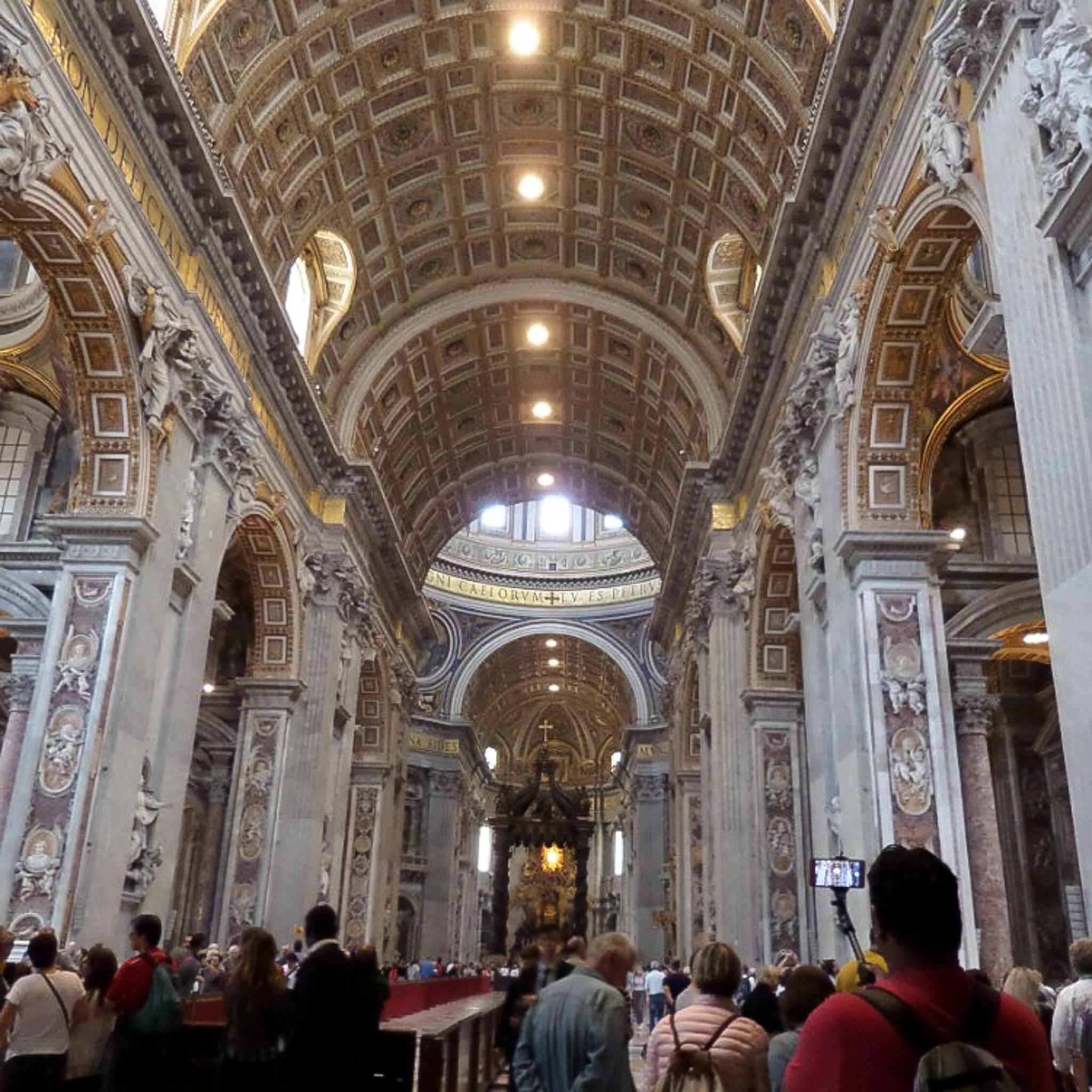 Multiple photos are associated with this record. Please click the links to view all of the items in the series. The images are of the nave of St. Peter's Basilica, originally designed by architect Bramante as a central plan at the behest of Julius II to be the largest, most magnificent church in Christendom when it was rebuilt in the early 16th century. Raphael and Michelangelo and later architects such as Maderno and Bernini designed and decorated the elongated nave to create a basilica which would hold large numbers of people and focus attention on the altar; therefore, it incorporates both Italian High Renaissance and Baroque sensibilities. It was begun in 1506 and completed in 1626. According to the Catholic Church, the very holy basilica is the burial site of Saint Peter. This photo shows the barrel vault of the nave's ceiling and, in the distance, the bronze baldacchino designed by Bernini, which stands beneath the dome and above the altar.