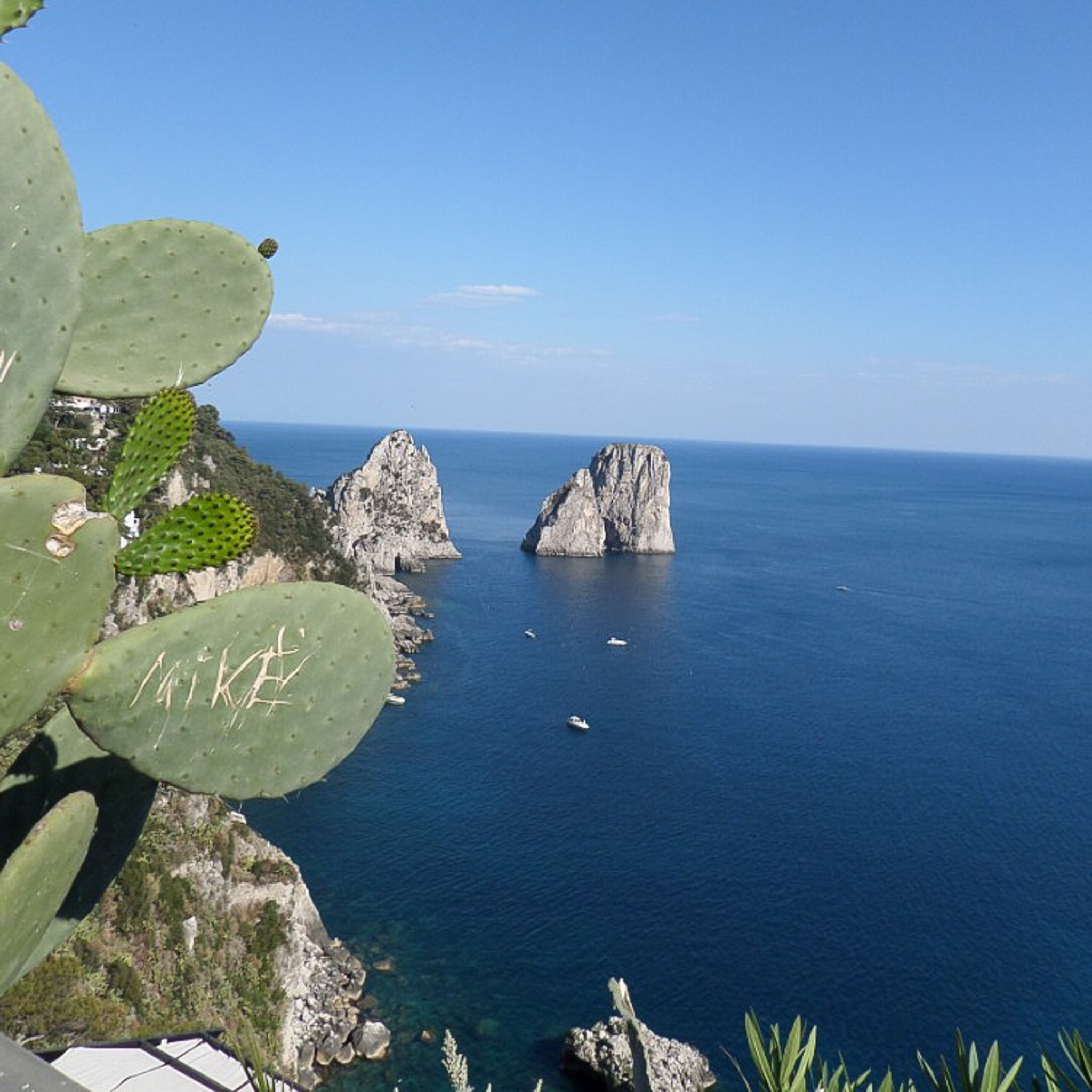 The Capri Faraglioni are famous rock formations off the Island of Capri, Italy. Faraglioni are stacks, a geological term referring to steep, vertical columns of rock in the sea near a coast, formed by wave erosion. The photograph was taken from the Gardens of Augustus. The foreground shows a cactus that was vandalized by a tourist.