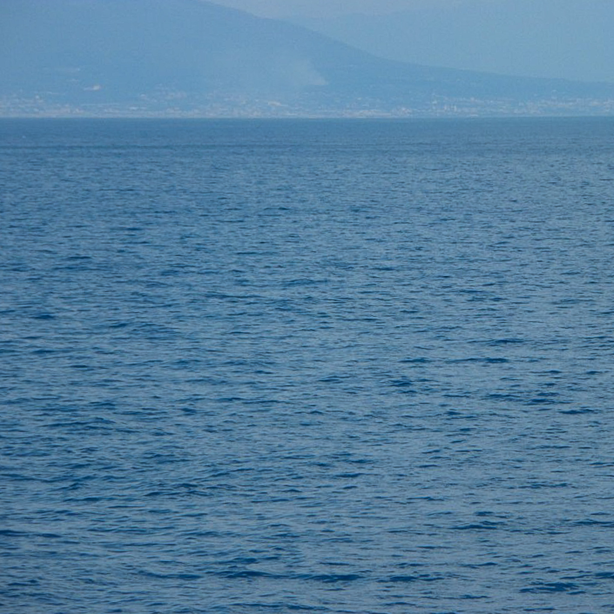 The beautiful blue water of the Gulf of Naples as seen near the Island of Capri, with the mainland of Italy in the background as additional hues of blue.