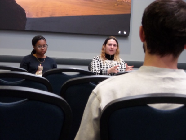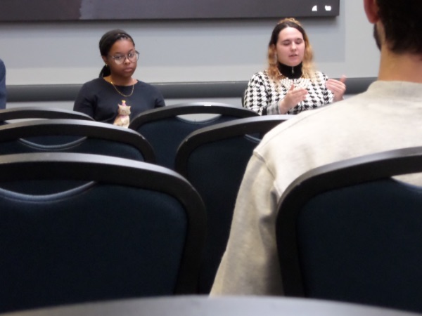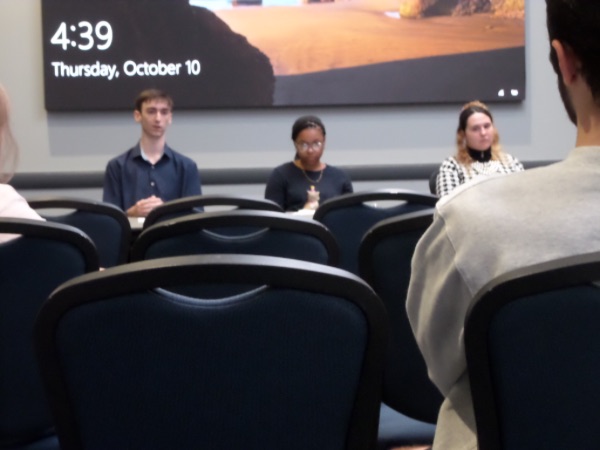 There are multiple photos in the series. Please click each link to see individual photos. Students (left to right) Gavin Sharkey, Cristal Haigler, and Megan Gorman entertain questions at the 2024 Humanities Undergraduate Research Conference. They were part of a panel titled "Individual, Community, Communication," which was moderated by Dr. John V. Garner from Philosophy.