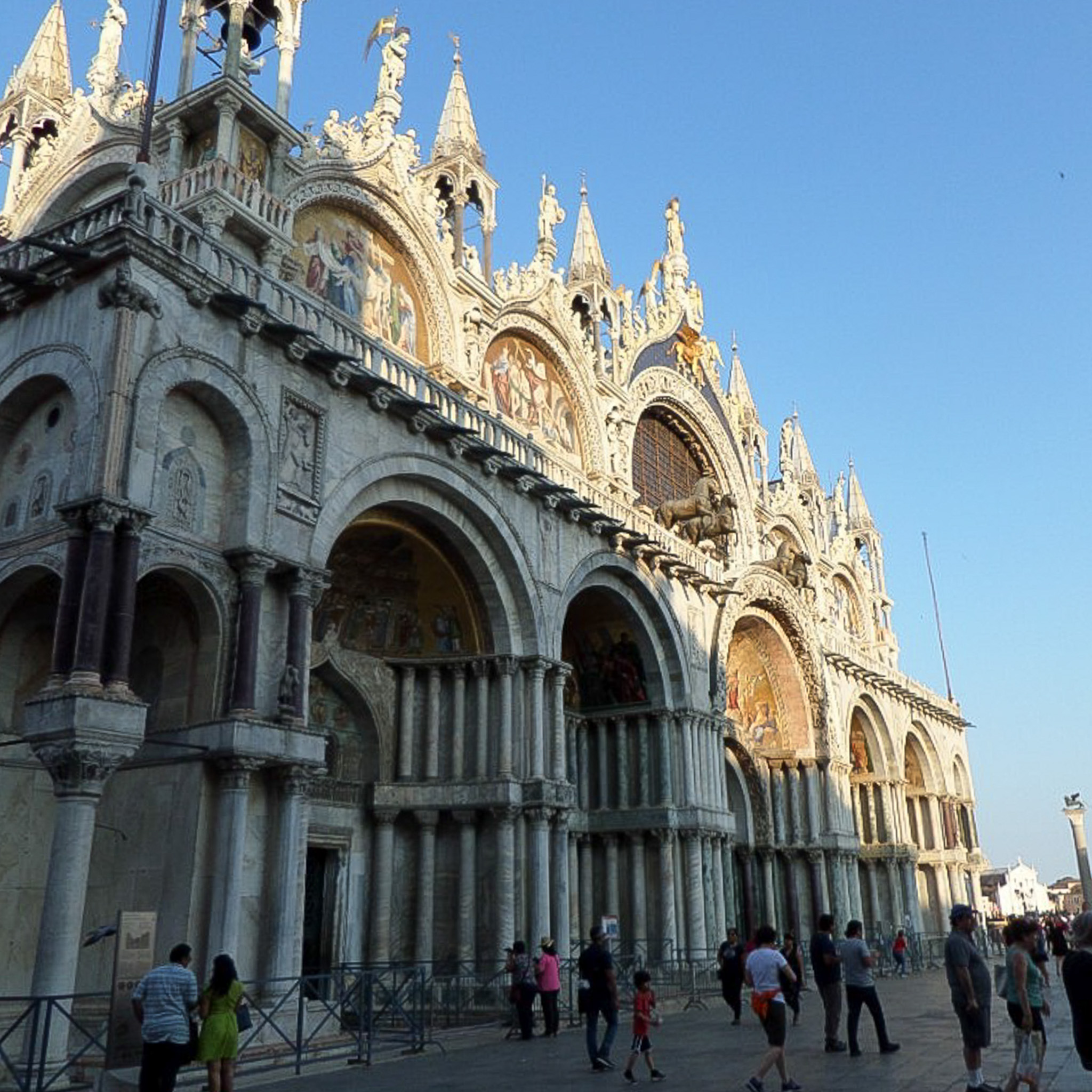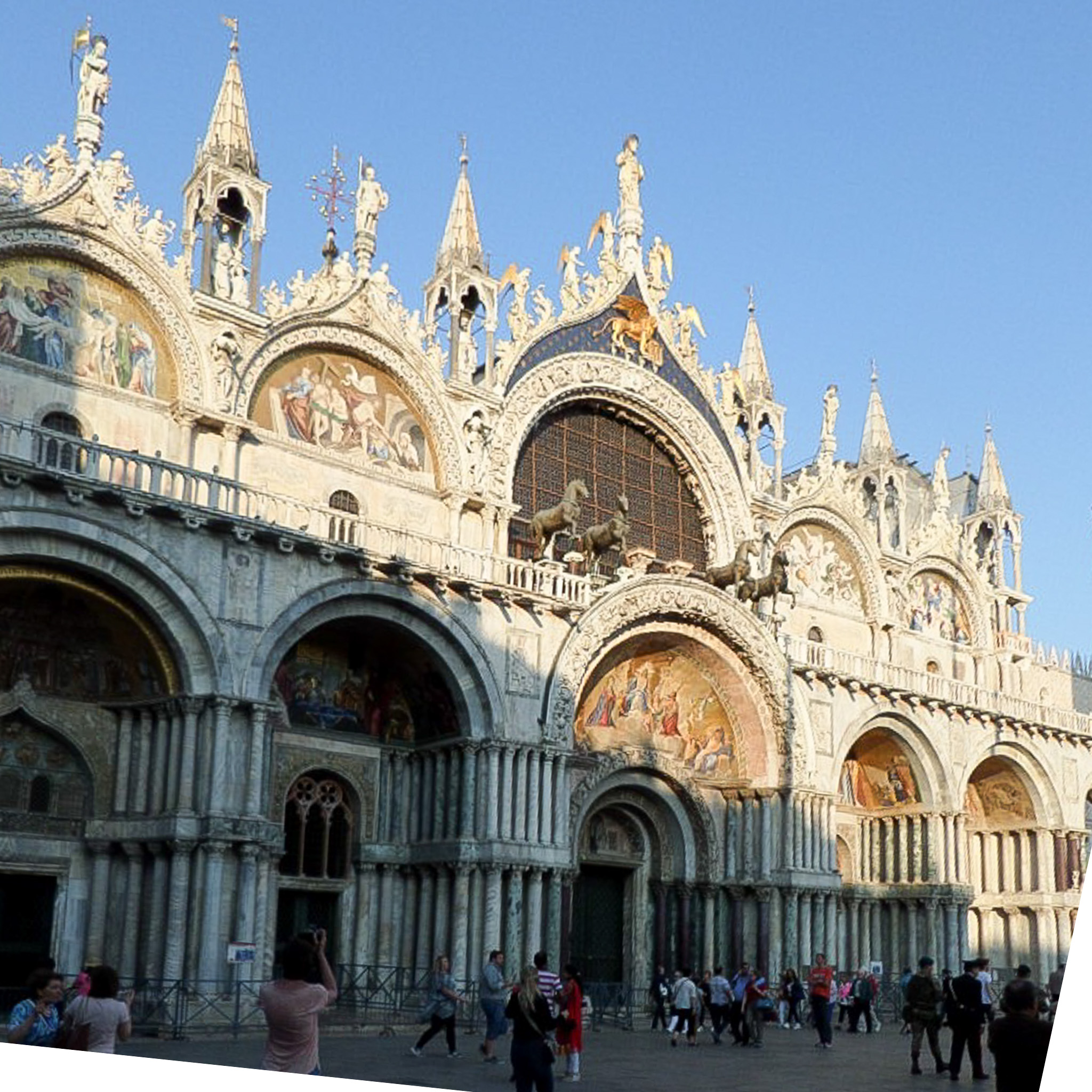 Multiple photos are associated with this record. Please click the links to view all of the items in the series. The photos show the western facade of St. Mark's Basilica, located in the San Marco district on the island of Venice, Italy. Venice (in Italian: Venezia) is a city in northeastern Italy that is built on a group of 126 islands separated by open water and canals, linked through 472 bridges. The historical island city is home to only 51K people, but a very popular tourist destination with about 60K tourists per day. A UNESCO World Heritage Site, it is renowned for its beauty, architecture, and artwork. The basilica is dedicated to Saint Mark the Evangelist and contains his relics. The church is sited on the eastern end of the Piazza of San Marco, the former center of the Republic of Venice, and is attached to the Doge's Palace. The building was consecrated in 1094 but altered over the next five centuries to its present appearance combining Eastern cupolas with Gothic tabernacles.