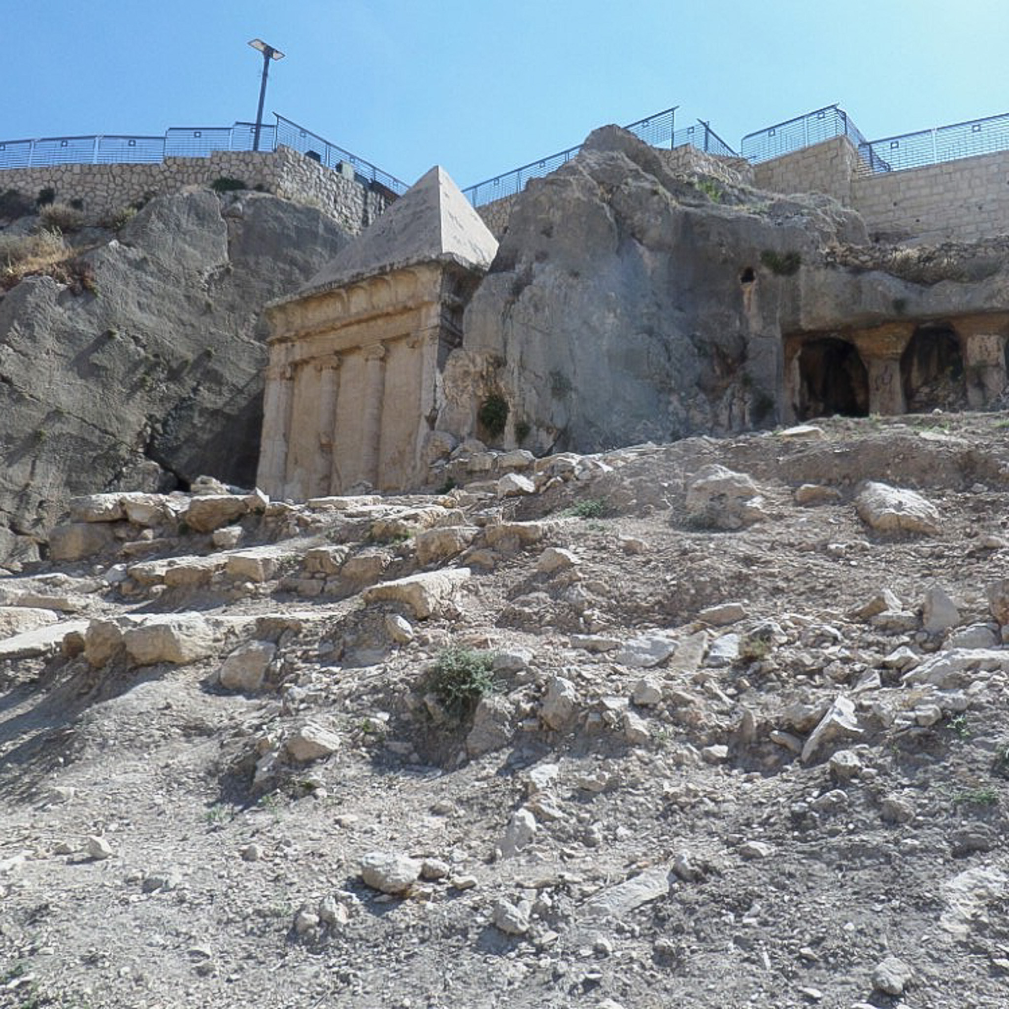 Just to the south of the Tomb of Benei Hezir is a monument known as the Tomb of Zechariah. It has Ionic columns. To its south is an unfinished tomb.