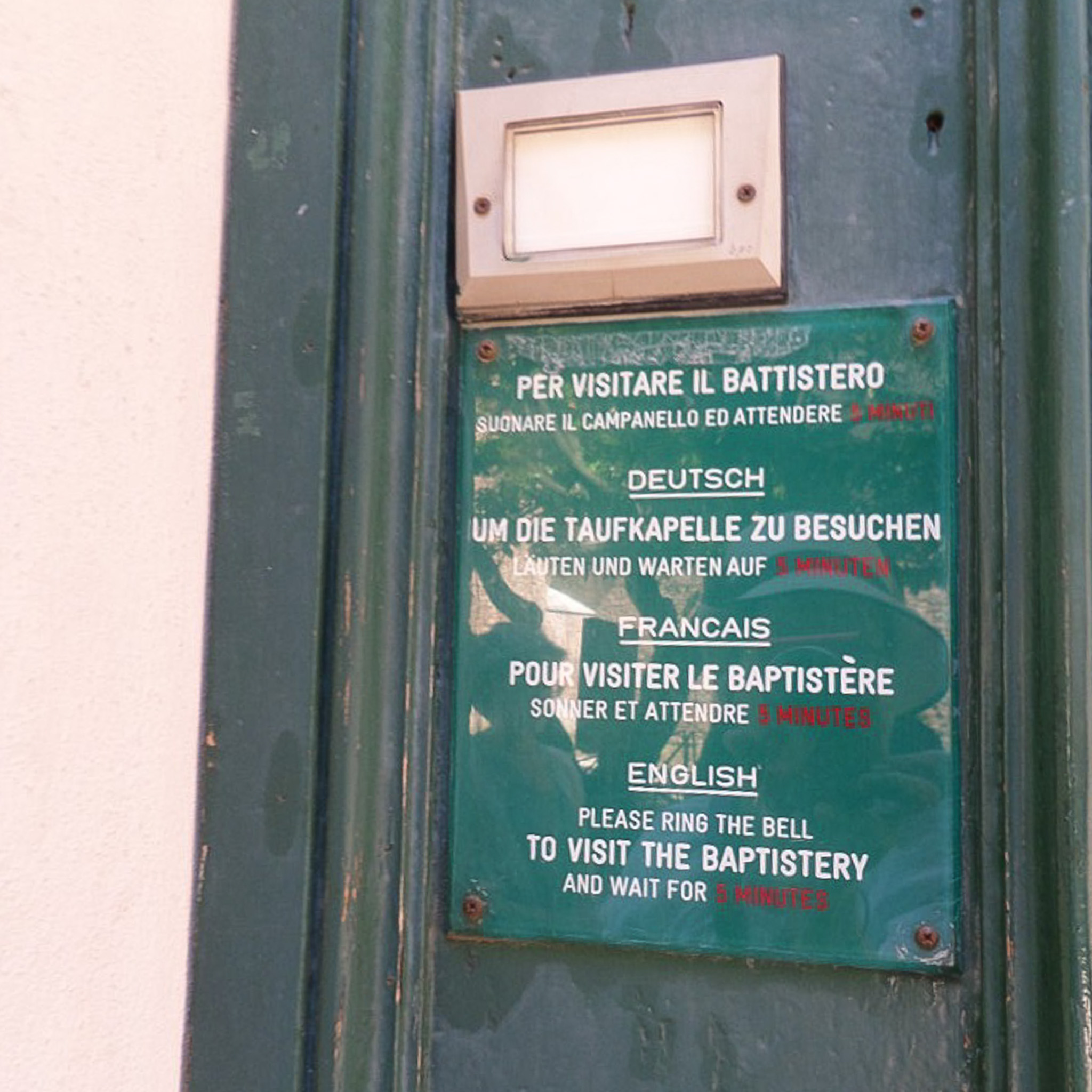 Signage in Italian, German, French, and English outside the Baptistery of the Orthodox (Neonian Baptistery; Baptistery of Neon; Battistero Neoniano; Orthodox Baptistery; Battistero Ortodosso; Baptistry of the Cathedral).