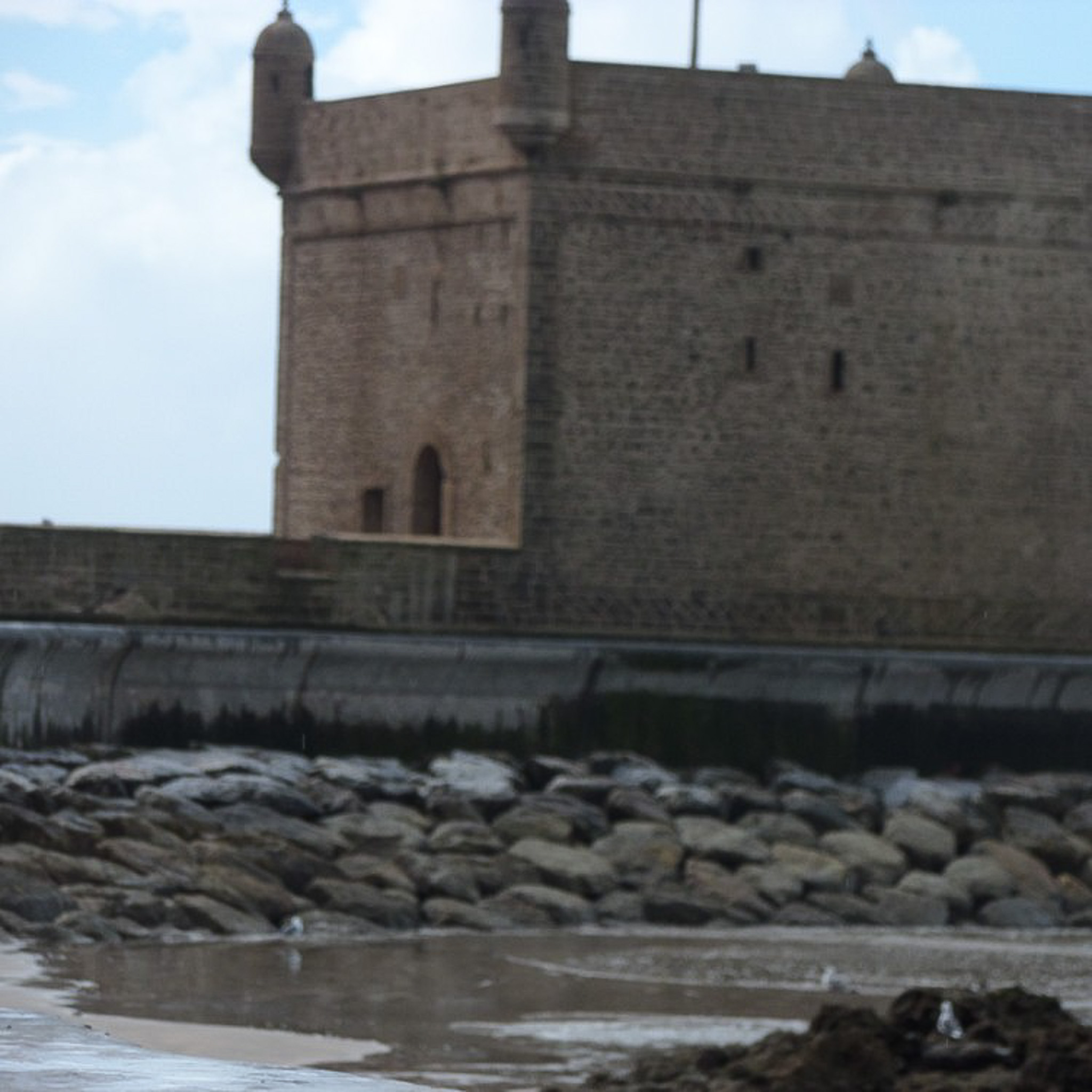 A view of the tower of Scala du Port (Sqala du Port), a square defensive tower built directly above the rocks of the coast of Essaouira. It was erected in Manueline style in the 18th century.