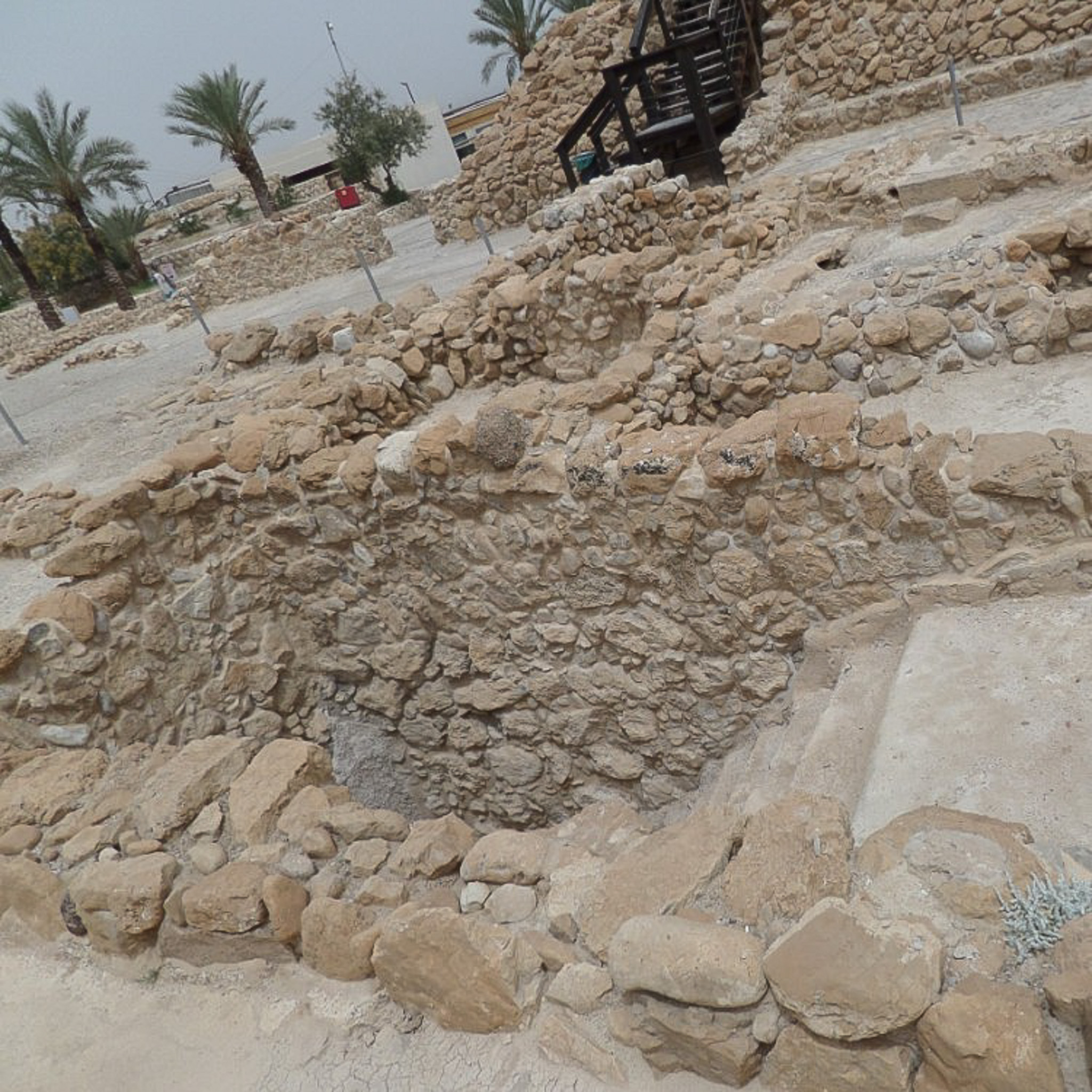 Walls of structures at Qumran. In the foreground are steps of the type that are common for Mikva'ot, or ritual baths.