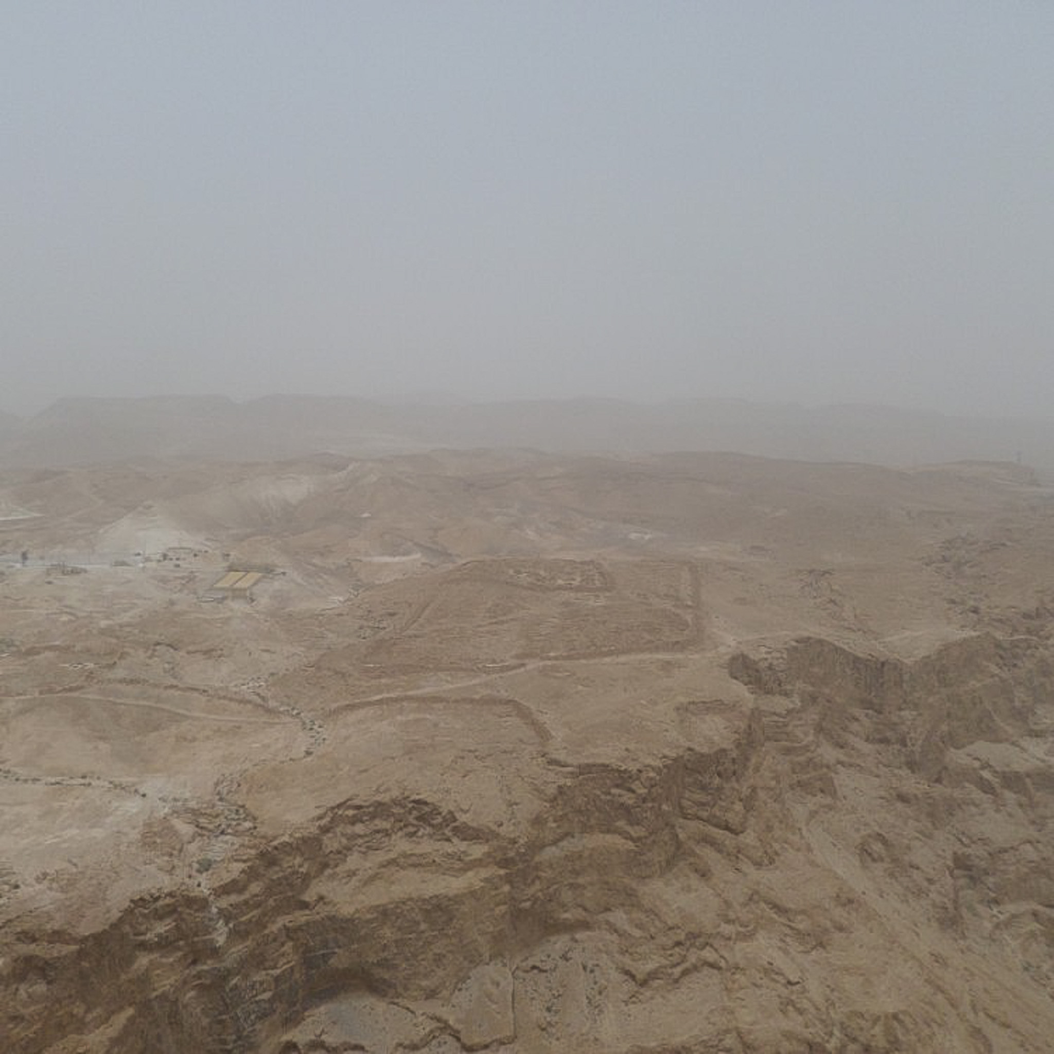 A Roman siege camp, remaining from the siege of the fortress during the Jewish-Roman War of the first century CE, is visible on a lower plateau to the northwest of Masada.