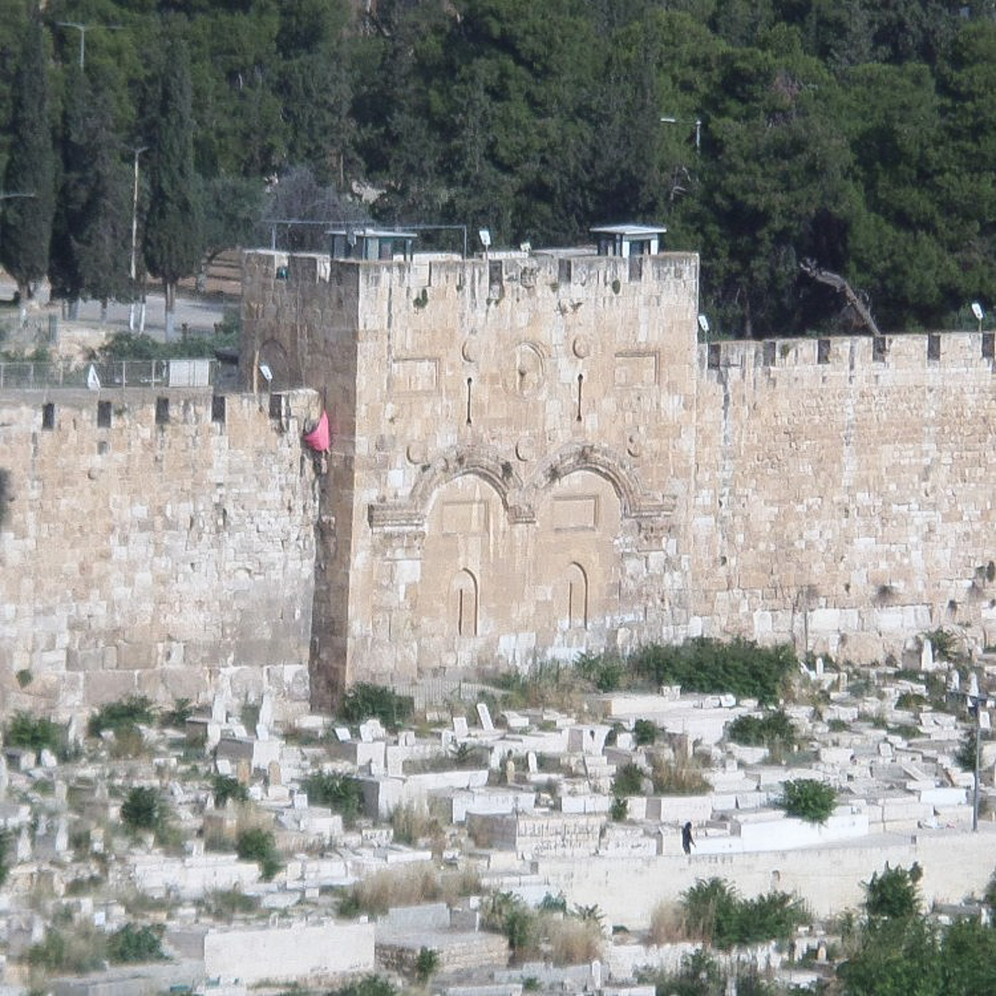 The only gate in the eastern side of the old city wall is sealed. IT is known variously as the Golden Gate or Mercy Gate. Although exact dating is unknown the present gate perhaps stands where a gate existed at the time of Josephus. It is often thought that the current gate dates from either the late Byzantine period of the Umayyad period. It has been walled in several times, the latest by Suleiman the Magnificent. The other side of the gate is the location of the HErodian Temple Mount.