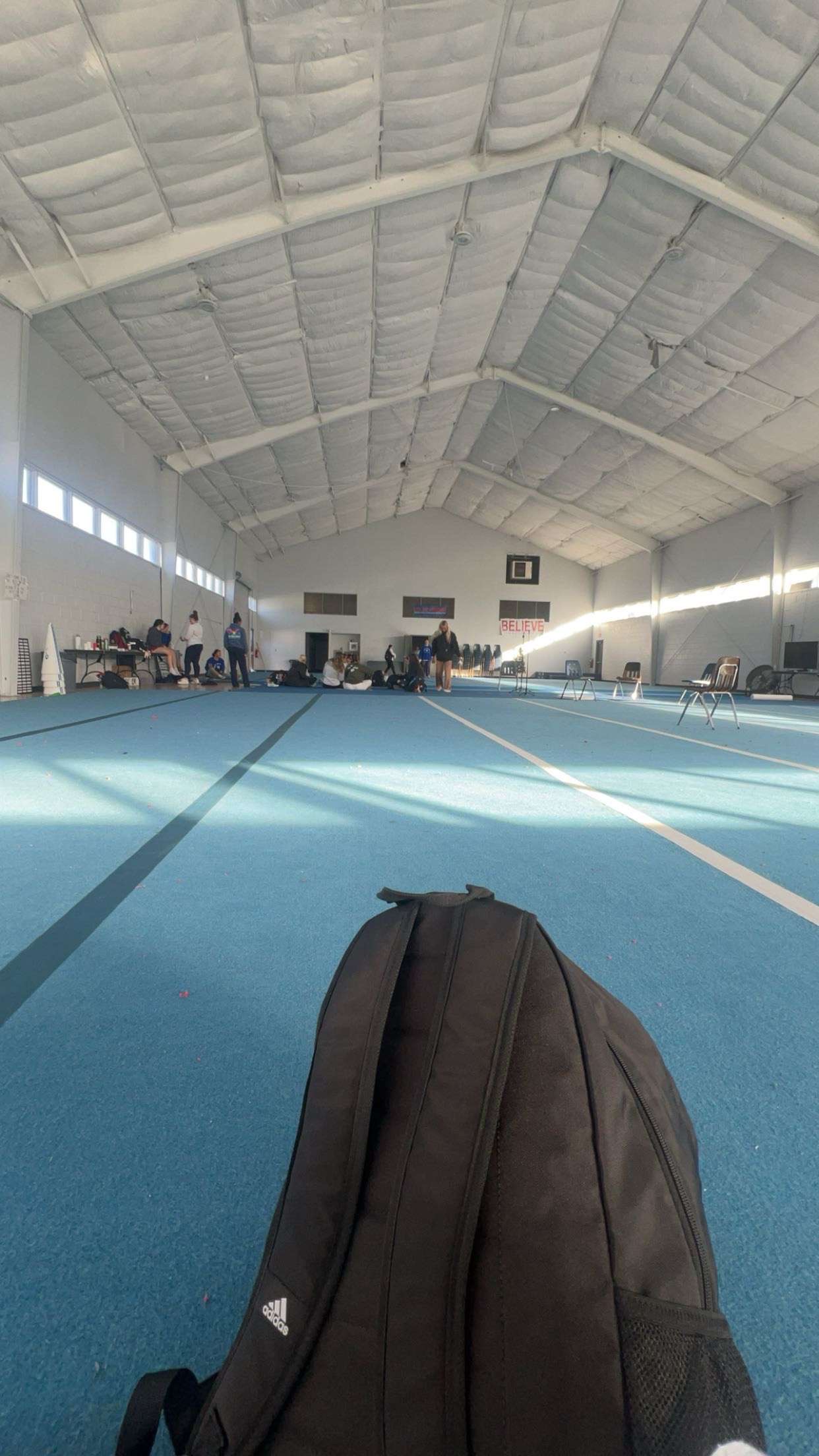 The photo depicts a large, rectangular building with white walls, blue carpet and a white metal roof that is covered with white padding to protect students engaged in stunts and high pyramids. In the foreground is a black backpack.