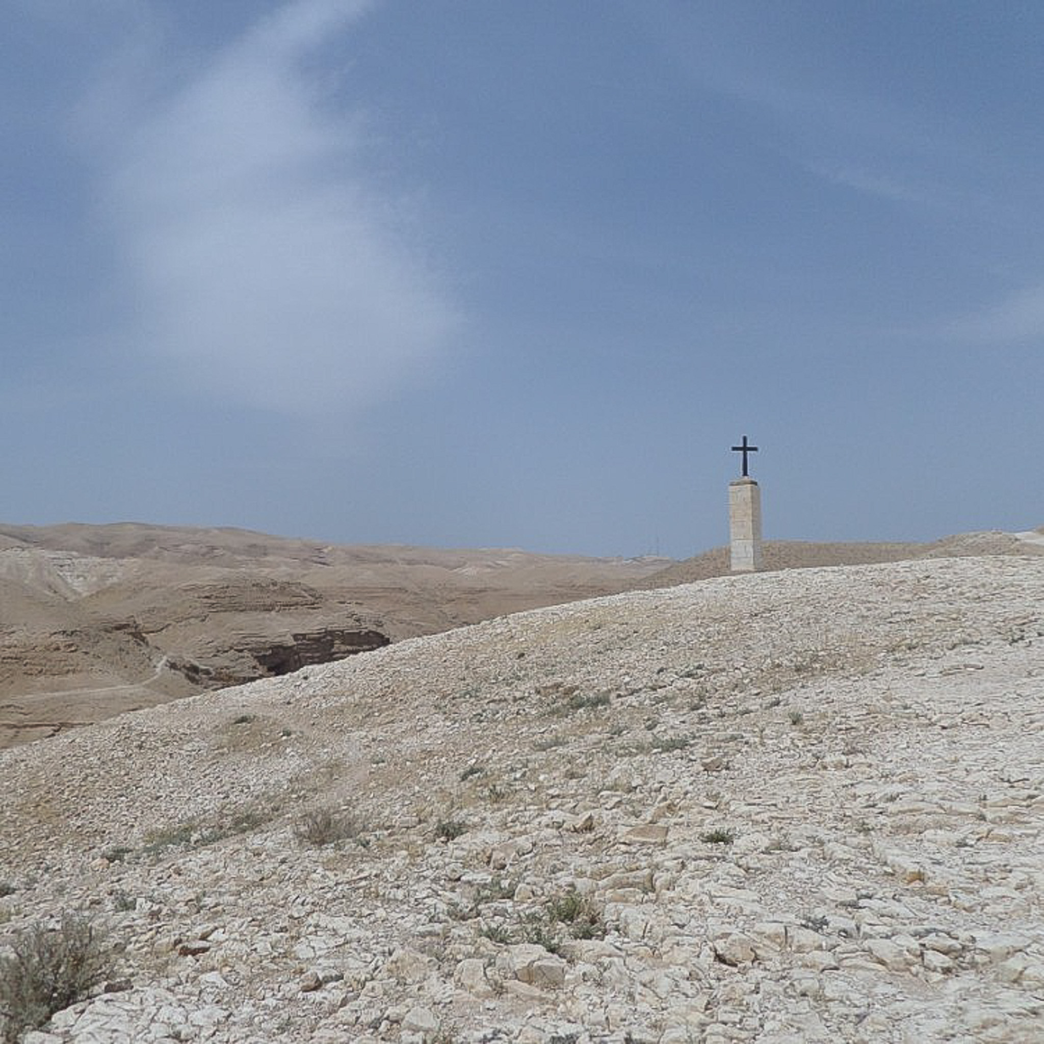 A cross marks the overlook point where tourists can view St. George's Monastery in Wadi Qelt.