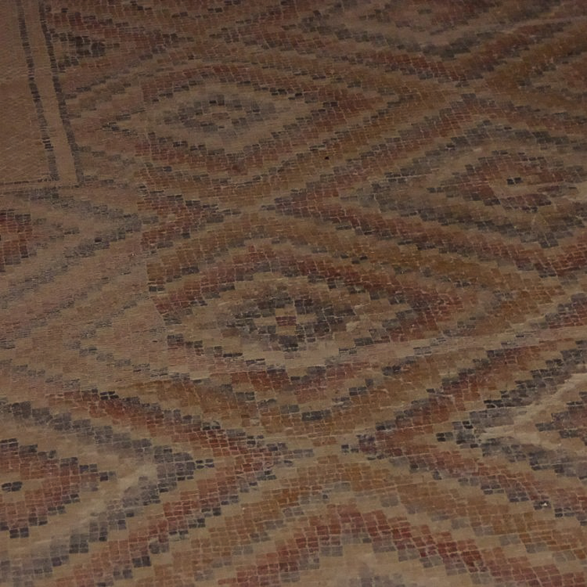 Close-up of the diamond-patterned mosaics in the cold bath of the palace portion of the complex.