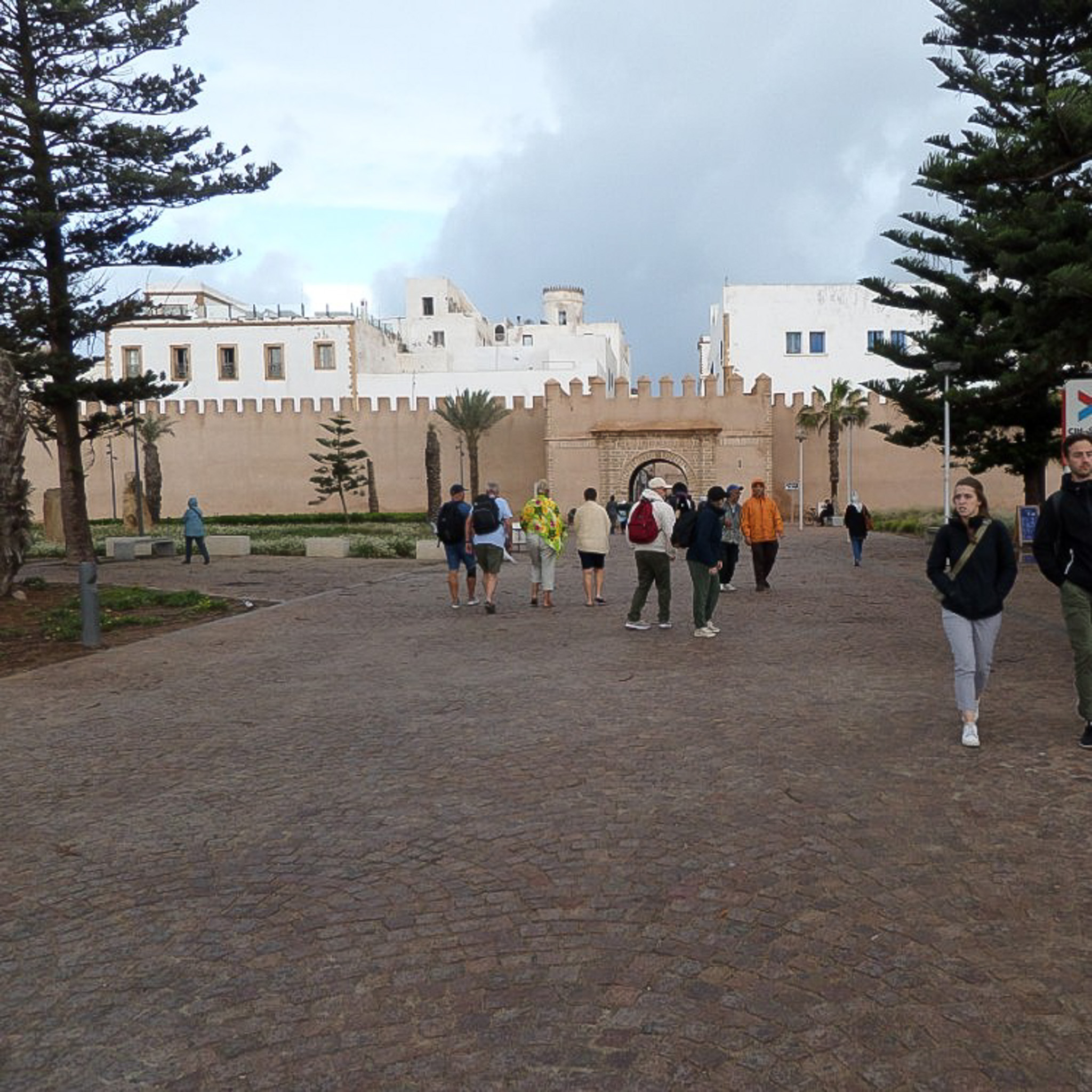 Outside view of Bab el-Sebâa, a southern entrance gate to the medina (the non-European part of a northern African city), showing ramparts on top of the walls. The kasbah zone of the medina was extended in the 19th century and new walls were built, requiring new gates. Bab el-Sebâa, or the Lion Gate or the Royal Gate, was built in 1866 by Houssein Gannoun El Fassi, during the reign of Sultan Mohammed Ben Abderrahman. It is in the Cherifian style: arched with square parapets, and covered in red plaster. Tourists obscure the view of the two cannons affixed to either side of the entrance at ground level. The foreground of the photo shows the detail of the circular pattern of cobblestones used as pavement, which continues inside the medina.