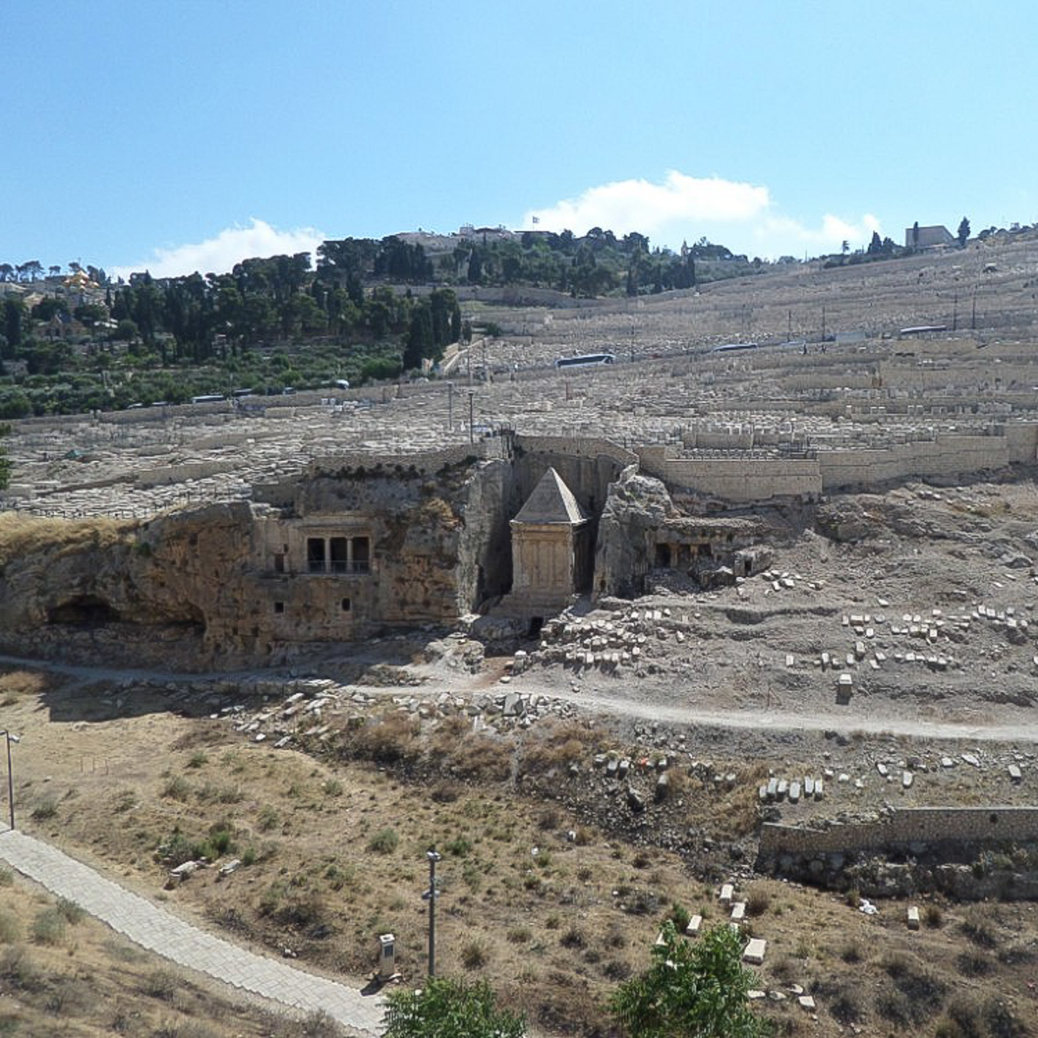 A series of 3 monumental tombs (the one on the far right is unfinished) in the Kidron Valley.