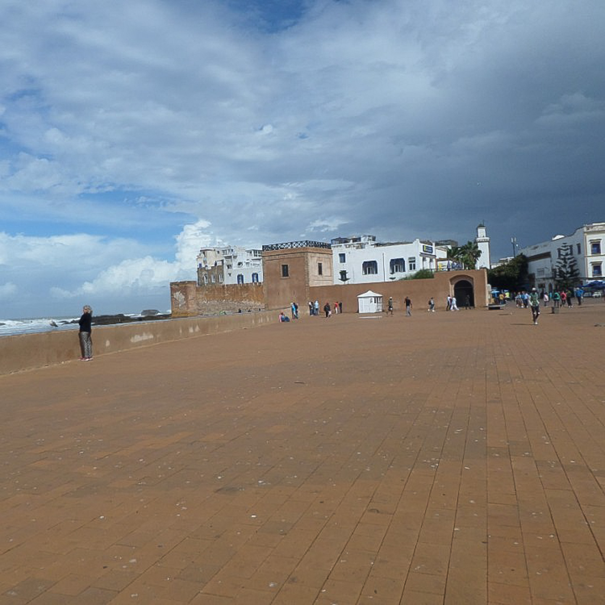 A large open square, or piazza, in Essaouira overlooking the sea, with the city in the background.