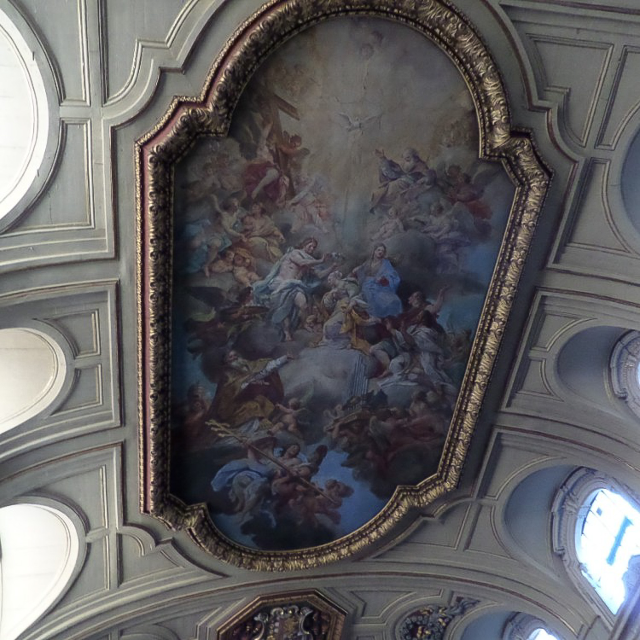 Located in Piazza di Santa Cecilia, the Basilica of Saint Cecilia in Trastevere (Basilica di Santa Cecilia in Trastevere) was built on the site of the house of a Roman martyr and her husband Valerian. Saint Cecilia was found guilty of trying to convert her husband and brother to Christianity and was martyred in 230 CE. She survived three days in a hot, steamy calidarium without suffocating, so a swordsman tried to behead her. He struck her three times, unsuccessfully, then dropped the sword in fear and ran away. She died three days later from her wounds. Saint Gregory the Great started construction of the basilica in the 6th century. Saint Cecilia's body was discovered intact in 820 in the catacombs of San Callisto after, legend says, a saint revealed its location to Pope Paschal I in a dream, and he ordered it to be transferred to the renovated church. In the 12th and 13th centuries the cloister, atrium, and bell tower were added to the basilica. Saint Cecilia's body was exhumed in 1599 during another renovation and was found still intact, wrapped in her white garment, with dried blood on her neck. A statue of this body, posed exactly how she was found, was sculpted by Stefano Maderno in 1600 and appears under the current altar, with her actual relics stored below. Today the basilica is under the care of the Benedictine nuns who live in the attached monastery. The site hosts one of the best archaeological sites in Rome. The photograph shows one of the frescoes on the ceiling of the nave. It is "The Coronation of Saint Cecilia," painted by Sebastiano Conca around 1727. It depicts her being crowned in heaven.