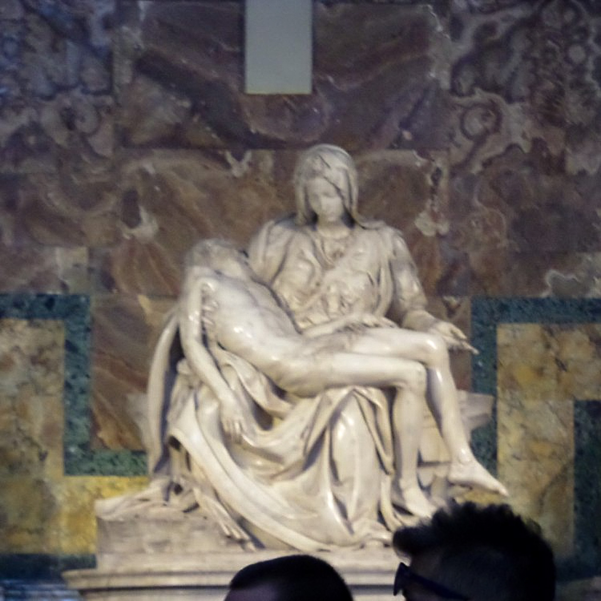 Multiple photos are associated with this record. Please click the links to view all of the items in the series. The images are of the Piet� by Michelangelo Buonarroti, which is located in a chapel to the right of the main entrance of St. Peter's Basilica. The church was originally designed by architect Bramante as a central plan at the behest of Julius II to be the largest, most magnificent church in Christendom when it was rebuilt in the early 16th century. Raphael and Michelangelo and later architects such as Maderno and Bernini designed and decorated the elongated nave to create a basilica which would hold large numbers of people and focus attention on the altar; therefore, it incorporates both Italian High Renaissance and Baroque sensibilities. It was begun in 1506 and completed in 1626. According to the Catholic Church, the very holy basilica is the burial site of Saint Peter. Michelangelo sculpted the life size masterpiece from a single block of white Carrara marble in 1498-1500 to depict Mary tenderly holding her crucified son. The statue is one of the most famous works of art in the world. It is displayed behind bulletproof acrylic glass today following restoration from an act of vandalism on May 21, 1972.