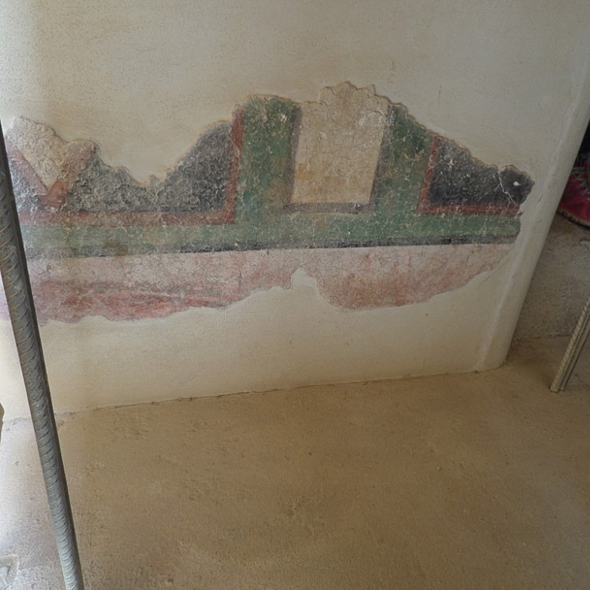 A fresco with geometric shapes (squares and diamonds) decorated the complex that has tentatively been identified as the fortress's command center. This fresco is blue, red, green and yellow.