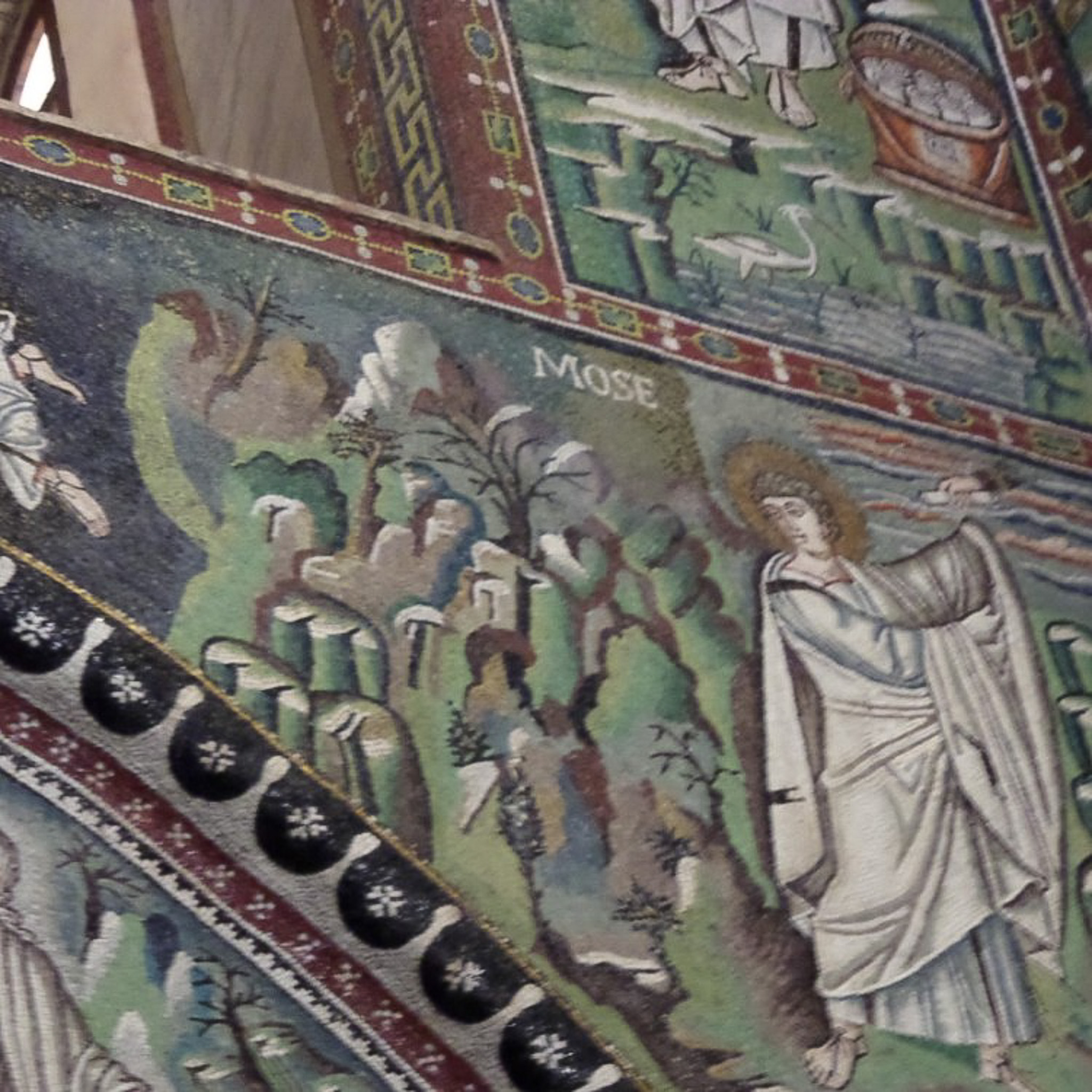 Partial image of the left lunette of the Presbytery, Basilica San Vitale (Basilica of St. Vitale; Church of Saint Vitale) in Ravenna, Italy. The photo shows a mosaic on the right arch support, which is of Moses receiving the sacred tablets on Mount Sinai. The partial image above Moses is that of St. Luke the Evangelist.