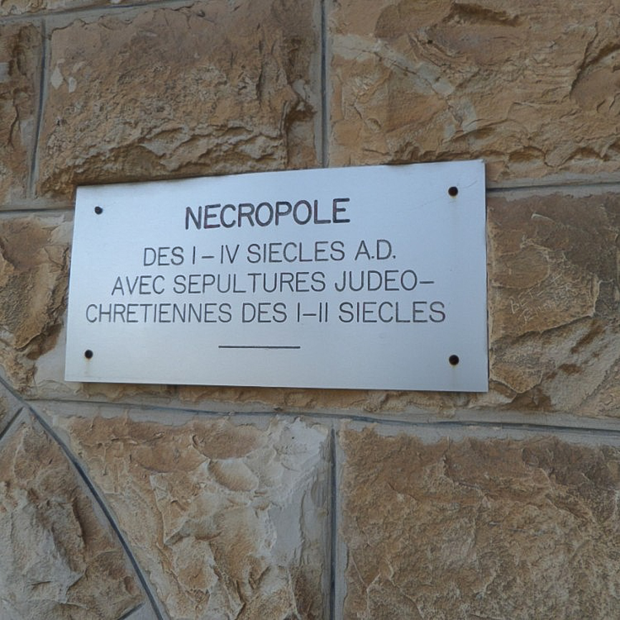 Signage on the Eastern Slope of the Kidron Valley reads, in German: Necropolis. First-4 Century AD with Judeo=Christian Sepulchres from the 1-2nd Centuries. The grotto this sign identified is filled with a variety of ossuaries, or small bone boxes.