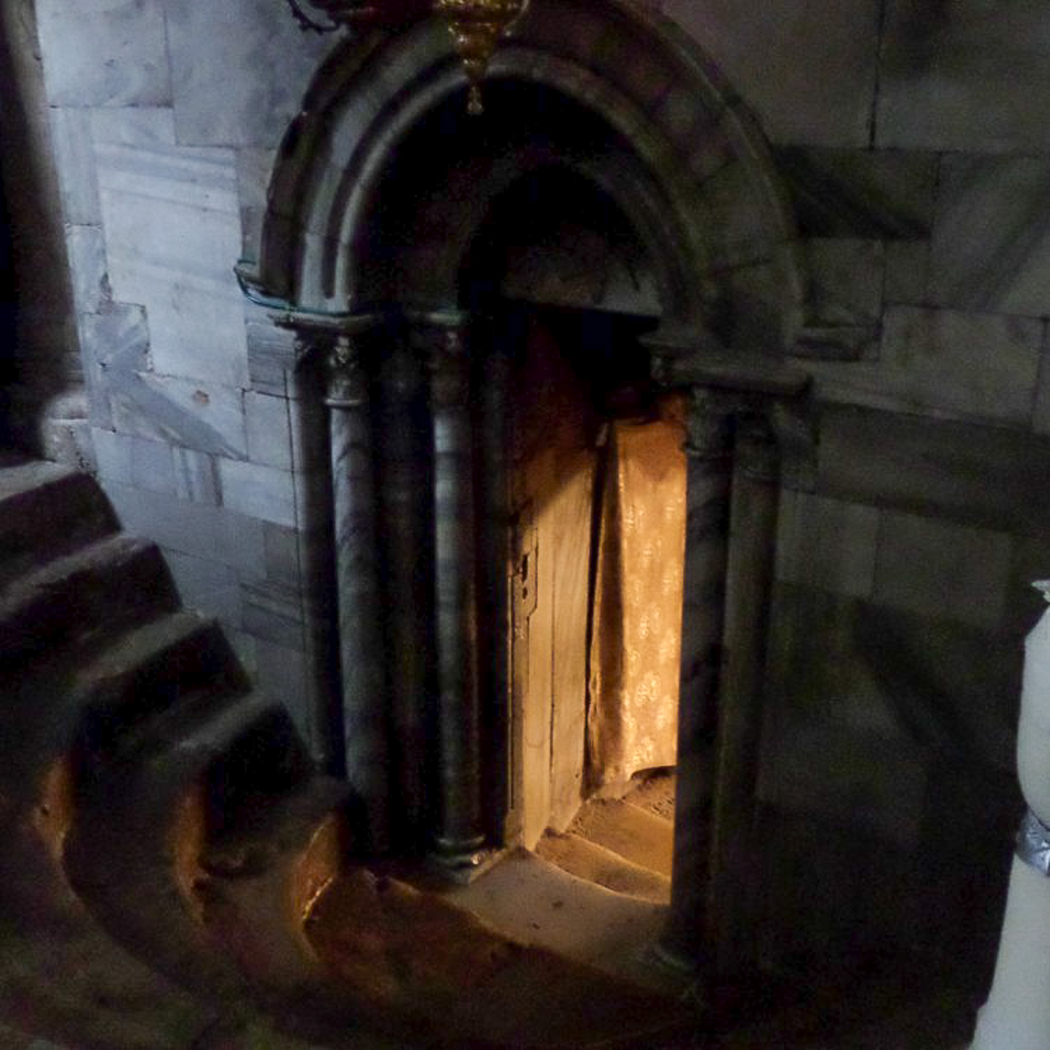 The entrance to the Nativity Grotto, a small chamber that has a star that designates the traditional place of the manger, is in the southern apse. At the time of this visit, a service was in progress in the grotto.