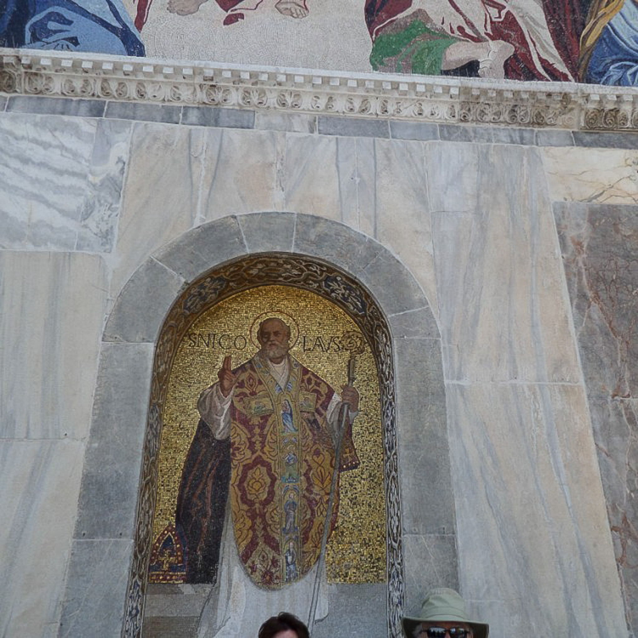 The photo shows a mosaic of St. Mark the Evangelist on the western facade of St. Mark's Basilica, located in the San Marco district on the island of Venice, Italy. Venice (in Italian: Venezia) is a city in northeastern Italy that is built on a group of 126 islands separated by open water and canals, linked through 472 bridges. The historical island city is home to only 51K people, but a very popular tourist destination with about 60K tourists per day. A UNESCO World Heritage Site, it is renowned for its beauty, architecture, and artwork. The basilica is dedicated to Saint Mark the Evangelist and contains his relics. The church is sited on the eastern end of the Piazza of San Marco, the former center of the Republic of Venice, and is attached to the Doge's Palace. The building was consecrated in 1094 but altered over the next five centuries to its present appearance combining Eastern cupolas with Gothic tabernacles. The photo shows a detail of the west facade's right side. The mosaic decorations of St. Mark's cover more than 8000 square meters. They depict scenes from the Bible, allegorical figures, events in the life of Christ, the Virgin Mary, Saint Mark, and other saints. The mosaic of St. Mark appears below the upper lunette's fourth mosaic, which depicts Christ's ascension to heaven.