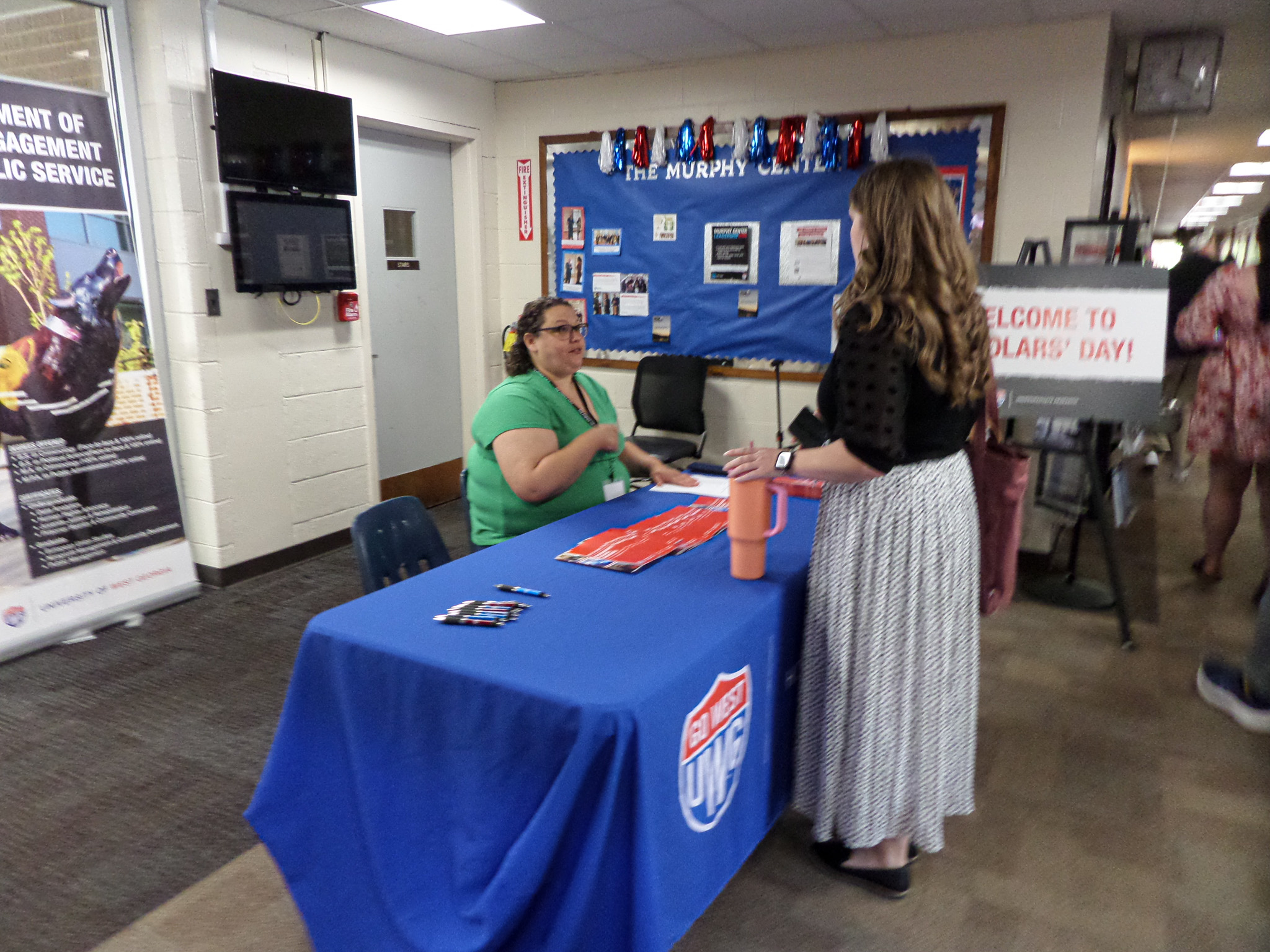 Upon entering Pafford Hall, the location of the paper presentation portion of UWG's Undergraduate Research Conference known as Scholars' Day, participants find Nikki Adair sitting at a table with a blue cloth imprinted with the UWG "Go West" logo. Nikki, the Office Manager for the Dean's Office of the University College, welcomes students to the event, hands out programs. and provides directions and other information to keep the event running.