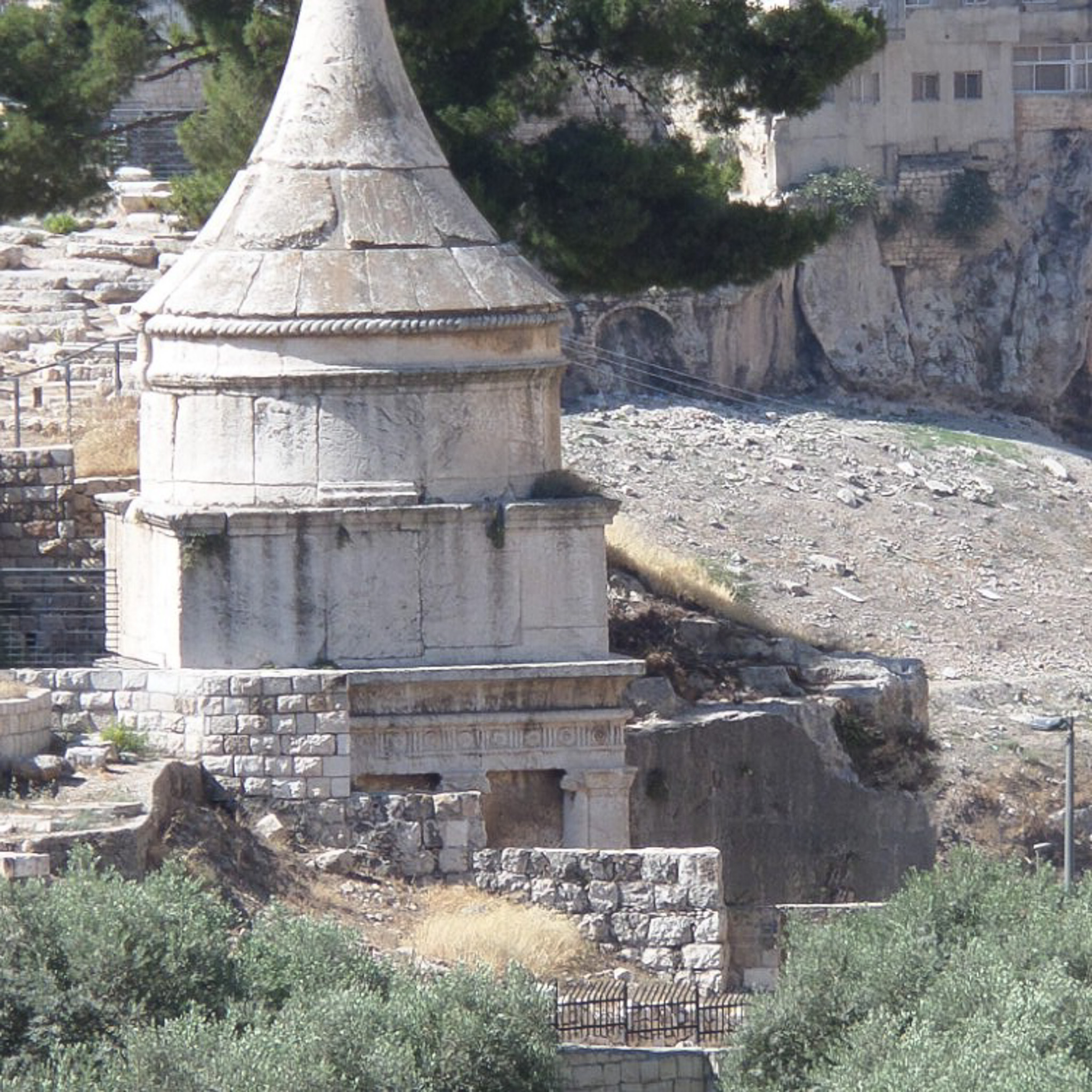 A monumental tomb in the Valley of Kings (Kidron Valley). It is a round-shaped monument with a distinctive conical roof.