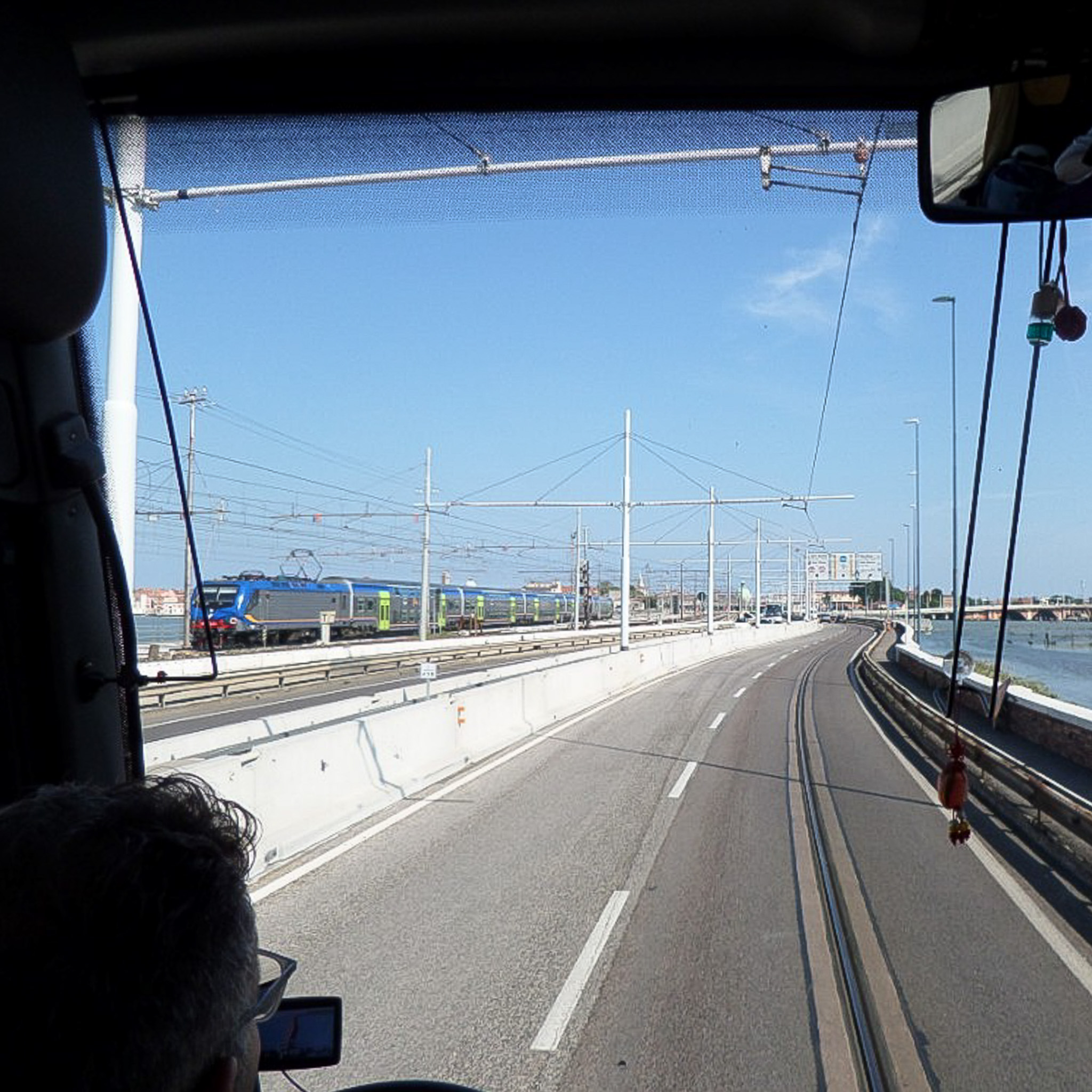 A photo taken from a bus as it travels on the road leading to the transit center for Venice, Italy. Venice (in Italian: Venezia) is a city in northeastern Italy that is built on a group of 126 islands separated by open water and canals, linked through 472 bridges. The historical island city is home to only 51K people, but a very popular tourist destination with about 60K tourists per day. A UNESCO World Heritage Site, it is renowned for its beauty, architecture, and artwork. Note the rail system on the left in the photo. No cars are allowed on the island itself.
