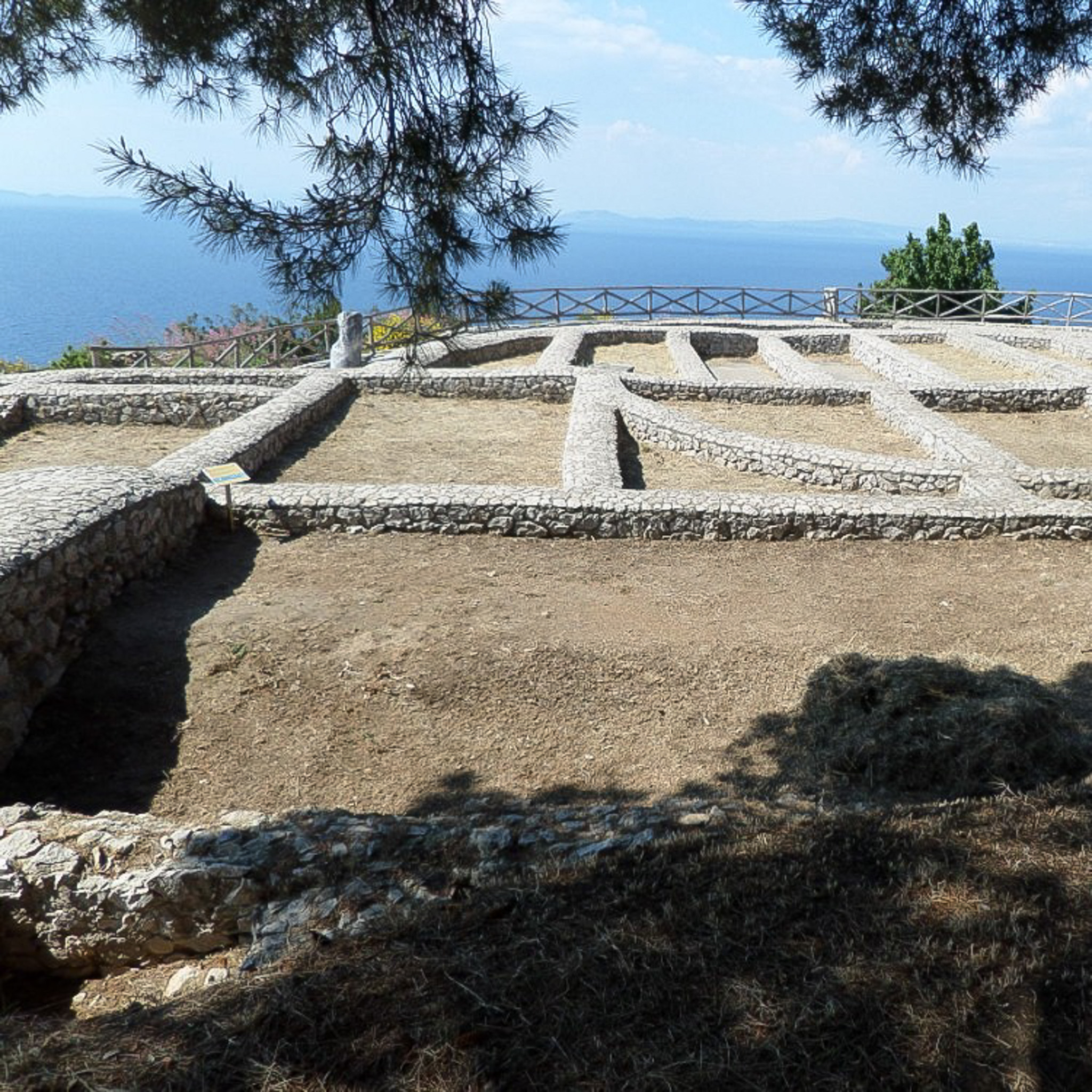 Remains of Villa Damecuta, which is one of twelve Augustan-Tiberian Roman villas on the Island of Capri, Italy. The Roman villa is in ruins today due to the eruption of Vesuvius in 79 A.D. and many raids by pirates. The ruins is located a short walk between the Blue Grotto and the municipality of Anacapri. "Damecuta" is derived from "Domus Cuta" (Dark and Hidden House), as Emperor Tiberius preferred small living spaces similar to caves. Augustus was the first Roman emperor and was succeeded by his stepson, Tiberius.