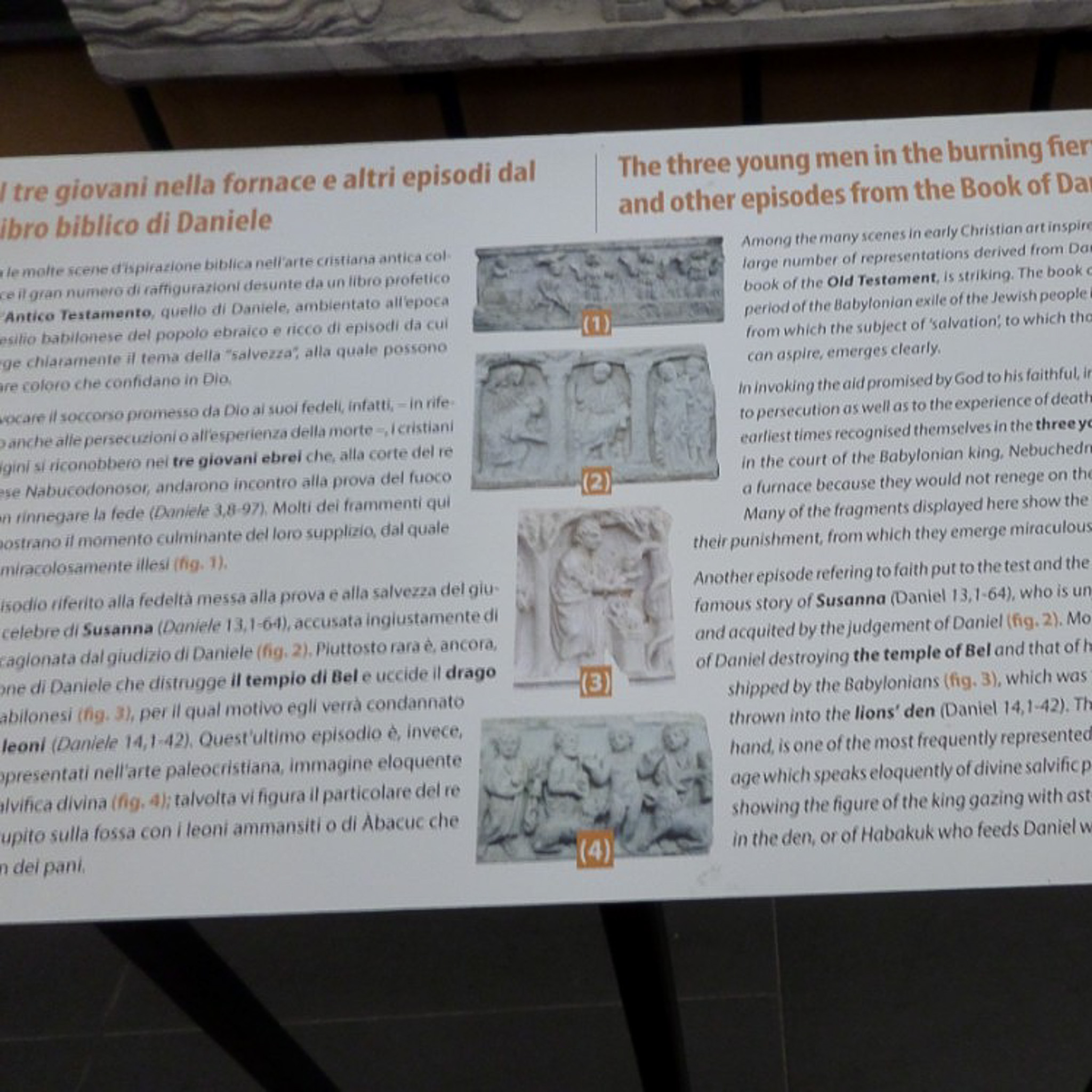 Multiple photos are associated with this record. Please click the links to view all of the items in the series. One photo shows signage in Italian and English that describes the object of the second photo. The object is a stone carving that depicts a scene from chapter three of the Book of Daniel (Bible, Old Testament) within the collection of the Pius Christian Museum of the Vatican Museums. The Vatican Museums are public galleries that display about 20,000 of 70K works collected by the Catholic Church and the papacy throughout the centuries. The museums were founded by Pope Julius II in the early 16th century. Only the Louvre in France receives more annual visitors than the Vatican Museums. The museums consist of 24 galleries, with the Sistine Chapel being the last room visited. The carving shows three Jewish men: Shadrach, Meshach, and Abednego, walking around unharmed in a fiery furnace. King Nebuchadnezzar II of Babylon attempted to burn them to death after they refused to bow down to his image; they said they only worshipped God. When the king saw that the men didn't burn, he let them out and praised God.