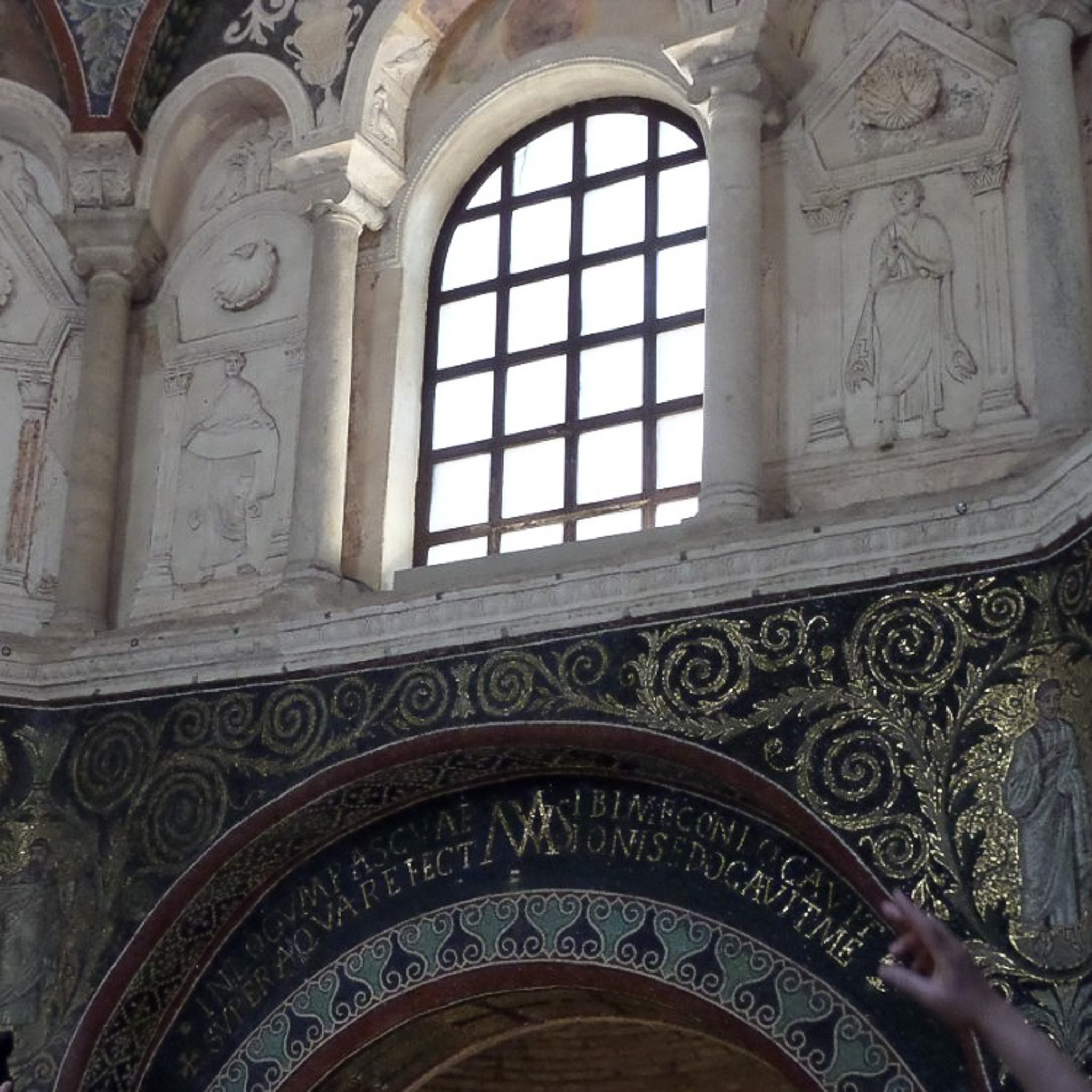 This image shows the division between the upper and lower arcades of the Baptistery of the Orthodox (Neonian Baptistery; Baptistery of Neon; Battistero Neoniano; Orthodox Baptistery; Battistero Ortodosso; Baptistry of the Cathedral). The upper arcade features stuccos of the Old Testament prophets on the contrary to the right and to the left of the windows. The frames of the lower niches have inscribed passages relating to baptism from both the Old and New Testaments.
